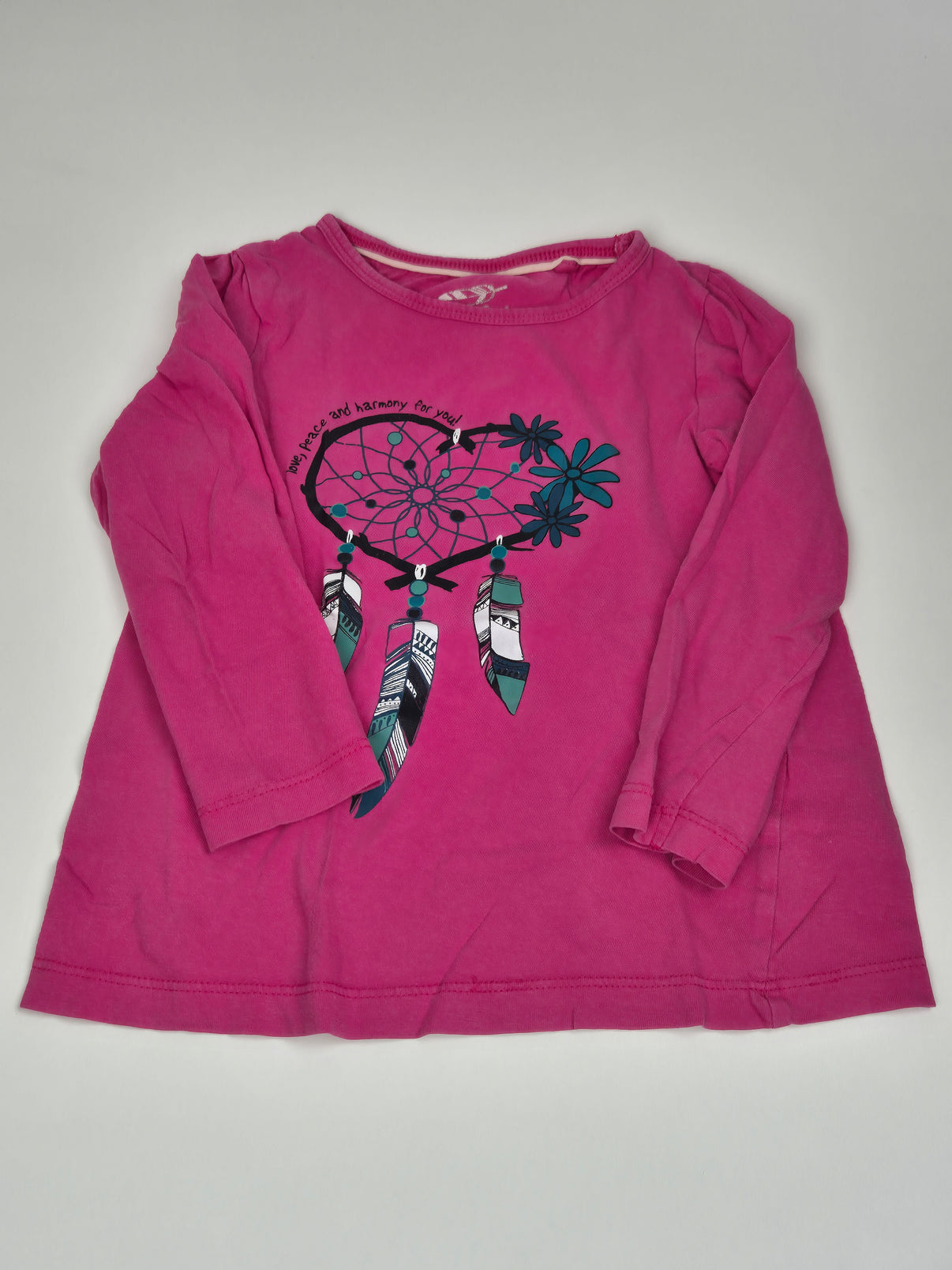 Sytě růžové tričko s dlouhým rukávem od Lupilu ozdobené krásným motivem lapače snů v teal a černých tónech. Romantický design s peříčky působí jemně a holčičím dojmem, skvěle se hodí do školky, na doma i na běžné nošení. Příjemný bavlněný materiál zajistí pohodlí po celý den a díky lehce áčkovému střihu tričko hezky sedí při pohybu.