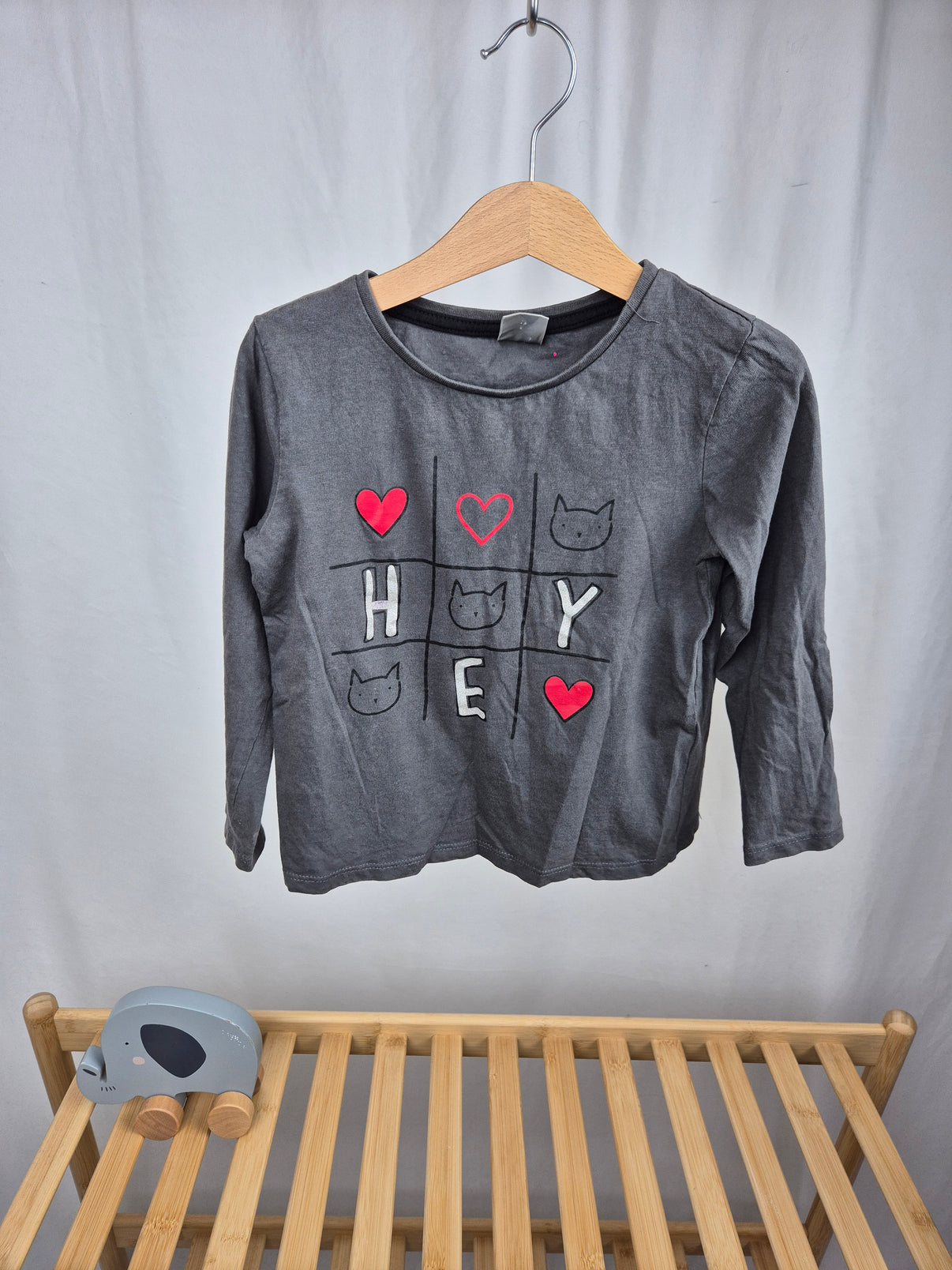 Stylové dívčí tričko s dlouhým rukávem značky Pepco v tmavě šedé barvě. Na přední straně má hravý motiv piškvorek s nápisem „HEY“, srdíčky a roztomilými obrysy kočičích hlaviček. Vyrobeno z příjemné bavlny, ideální pro běžné nošení do školy, školky nebo na doma.