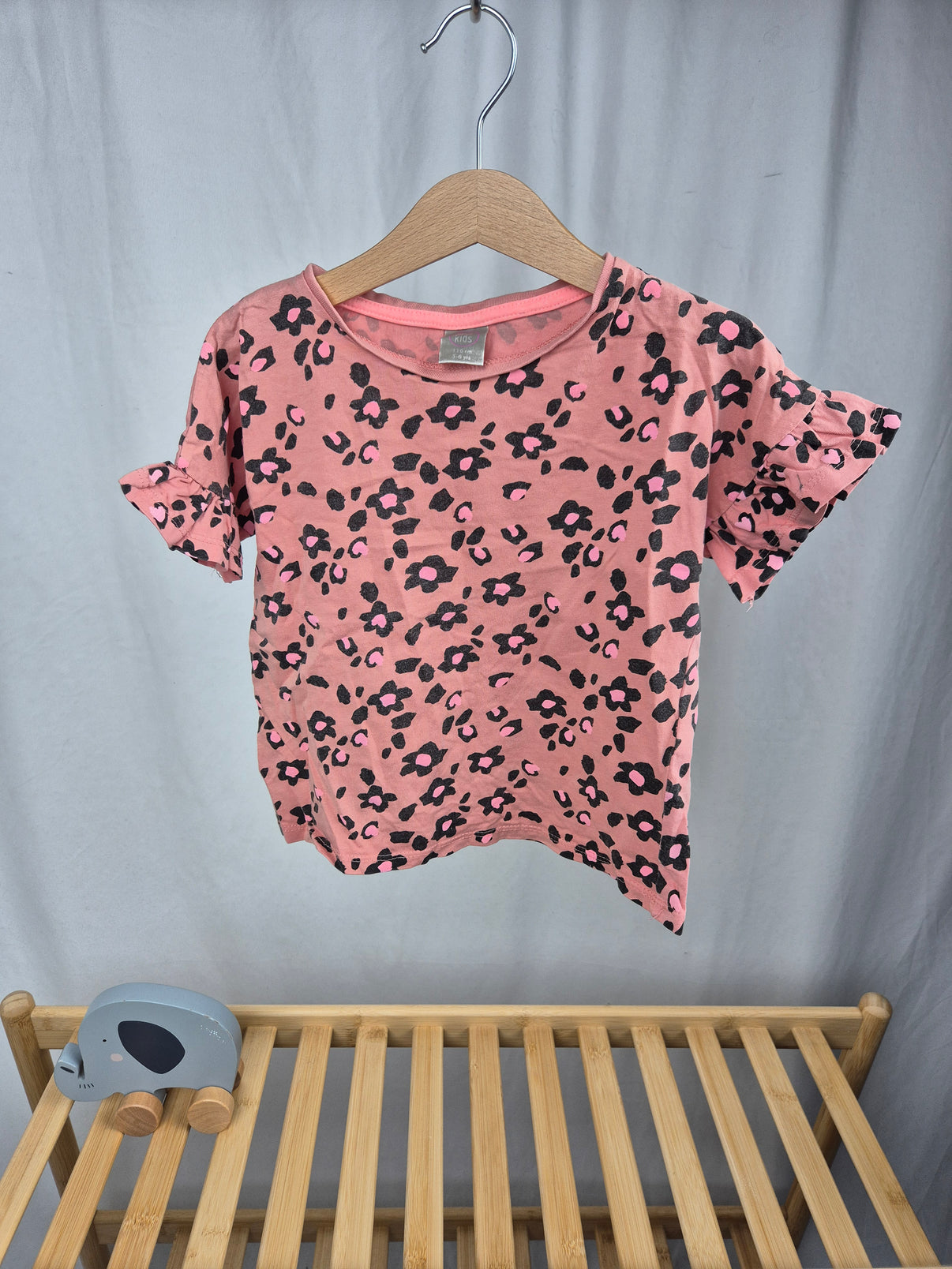 Stylové dívčí tričko Pepco v lososově růžové barvě s černým leopardím potiskem. Má krátký rukáv s jemným volánkem a klasický kulatý výstřih. Lehký, prodyšný materiál z bavlny je ideální na léto nebo do školky. Pohodlný střih a hravý vzor potěší každou malou parádnici.