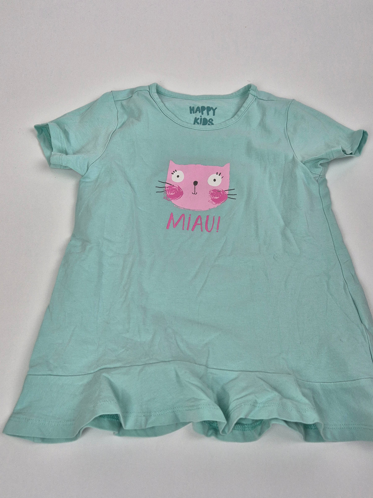 Roztomilé tričko značky Tchibo v mátově zelené barvě s veselým potiskem růžové kočičky a nápisem MIAU!. Vyrobené z kvalitní bavlny, která je měkká a příjemná na dotek. Spodní lem je zakončený volánkem, který tričku dodává dívčí půvab. Ideální volba na běžné nošení do školky i na hřiště — prostě pohodlný a hravý kousek pro holky, které milují zvířátka.