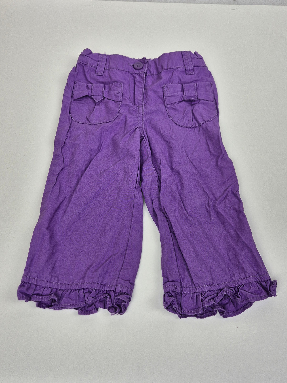 Roztomilé tříčtvrteční kalhoty značky Palomino ve velikosti 104 v krásném fialovém odstínu. Vyrobené z lehké bavlny, ideální na teplejší dny. Kalhoty mají ozdobné kapsy s mašličkami a volánkový lem nohavic, který dodává celkovému vzhledu jemně dívčí styl. Díky pohodlnému střihu a pružnému pasu jsou ideální na běžné nošení do školky i na hřiště. Perfektní volba pro holky, které se rády cítí pohodlně, ale zároveň stylově. 🌸