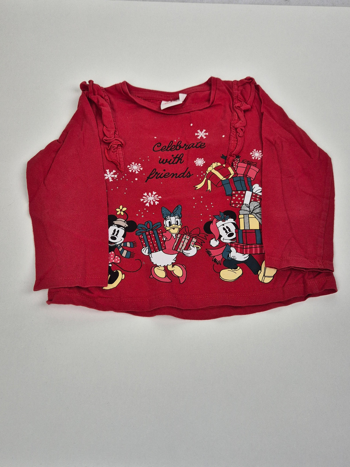 Veselé vánoční tričko Pepco s Minnie Mouse ve velikosti 104. Červený základ doplňuje potisk oblíbených Disney postaviček Minnie, Mickeyho a Daisy s vánočními dárky a sněhovými vločkami. Tričko má dlouhý rukáv a zdobné volánky na ramenou, které mu dodávají sváteční nádech. Vyrobené z měkké bavlny, ideální pro vánoční oslavy, focení nebo pohodlné domácí chvíle.