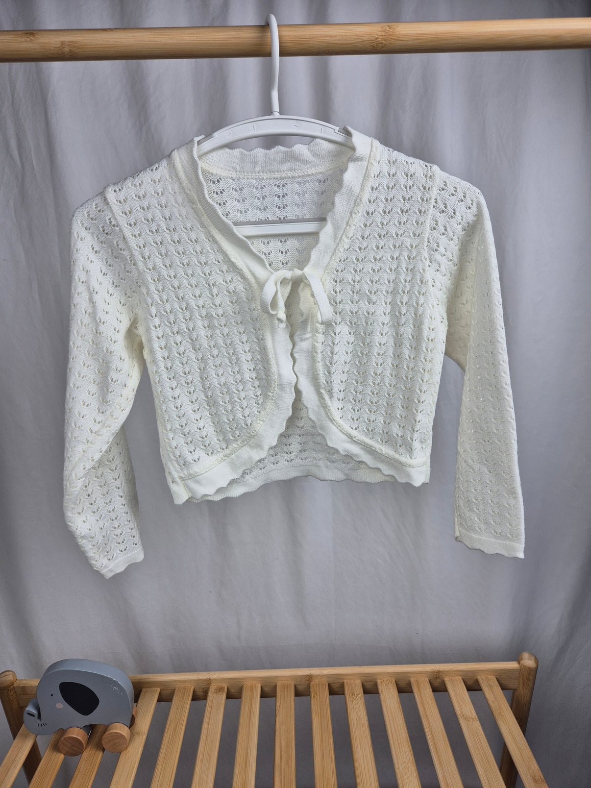 Jemné bílé pletené bolerko s dlouhým rukávem, ideální přes šaty nebo slavnostní halenku. Bolerko má decentní krajkový vzor, vázání na mašličku vpředu a vlnkované zakončení lemů, které mu dodává elegantní vzhled. Skvělý doplněk pro holčičky na oslavy, svatby nebo jiné slavnostní příležitosti – krásně doladí každý outfit a zároveň příjemně zahřeje.