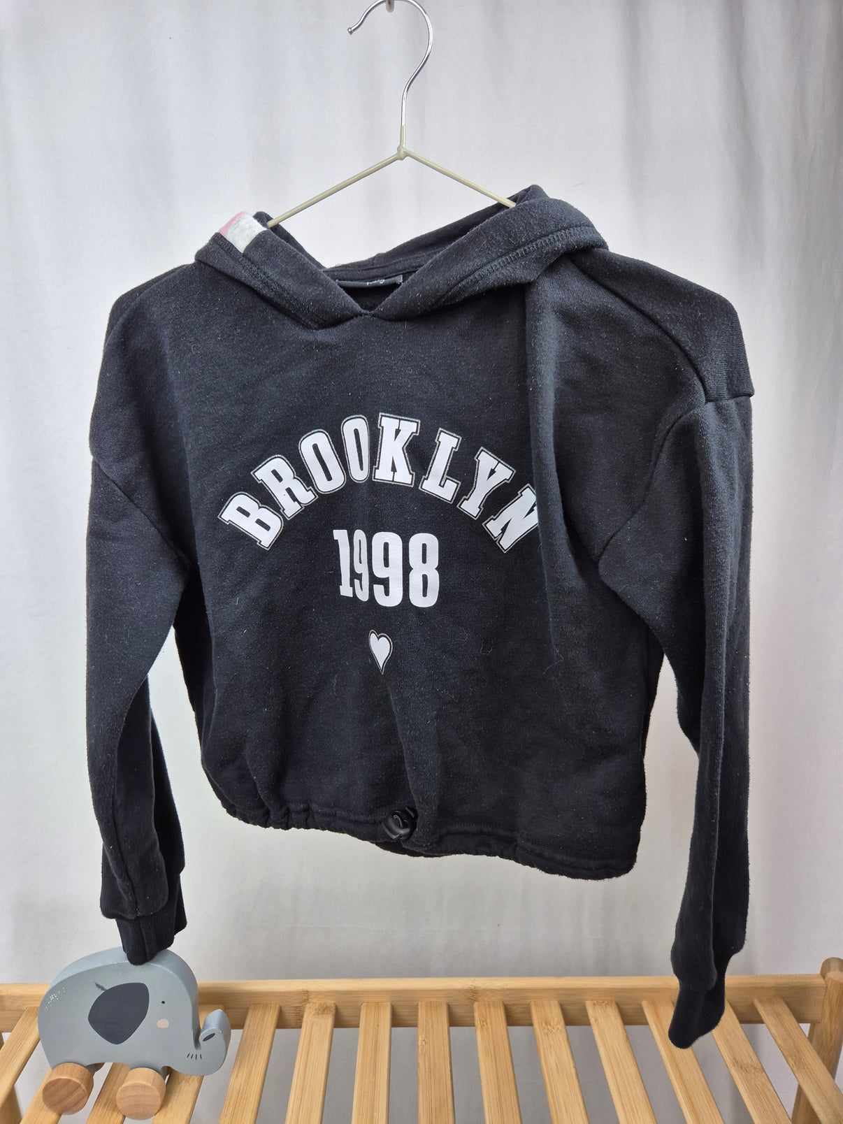 Černá crop mikina s kapucí od značky Takko ve velikosti 134/140 je ideálním kouskem do školy i na volný čas. Přední stranu zdobí výrazný potisk s nápisem Brooklyn 1998 v bílé barvě, který dodává mikině městský styl. Kratší střih s pružným spodním lemem působí moderně a hodí se k džínům nebo legínám. Skvělý kousek pro holky, které mají rády pohodlí i trendy vzhled.