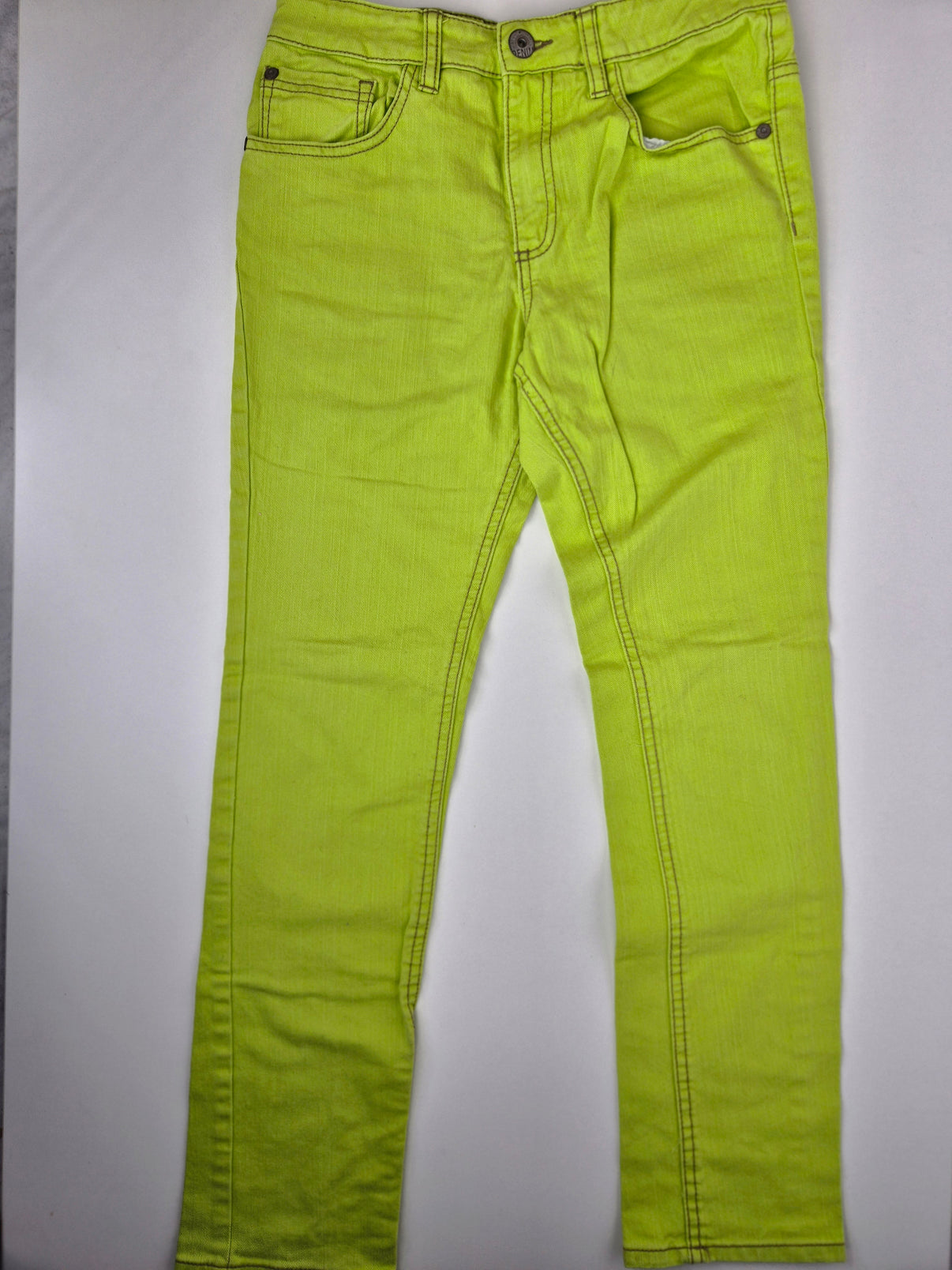 Jsou z denimového materiálu v neonově limetkové barvě, se stylovým kontrastním prošíváním. Mají klasický střih s pěti kapsami, zapínání na knoflík a zip, a nastavitelný pas na gumu uvnitř pro perfektní padnutí.