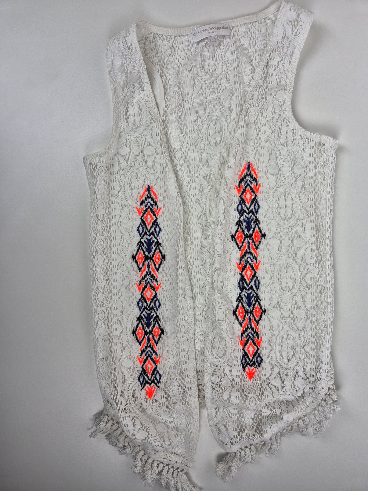 Lehký háčkovaný kardigan Charles Vögele v bílé barvě s etno výšivkou v odstínech tmavě modré a neonově korálové. Volný střih bez zapínání, na spodním okraji zdobený jemnými třásněmi. Díky prodyšnému krajkovému materiálu je ideální pro letní dny – skvěle se hodí přes tílko, šaty nebo plavky. Stylový doplněk pro malé slečny, které se chtějí cítit jako velké dámy.