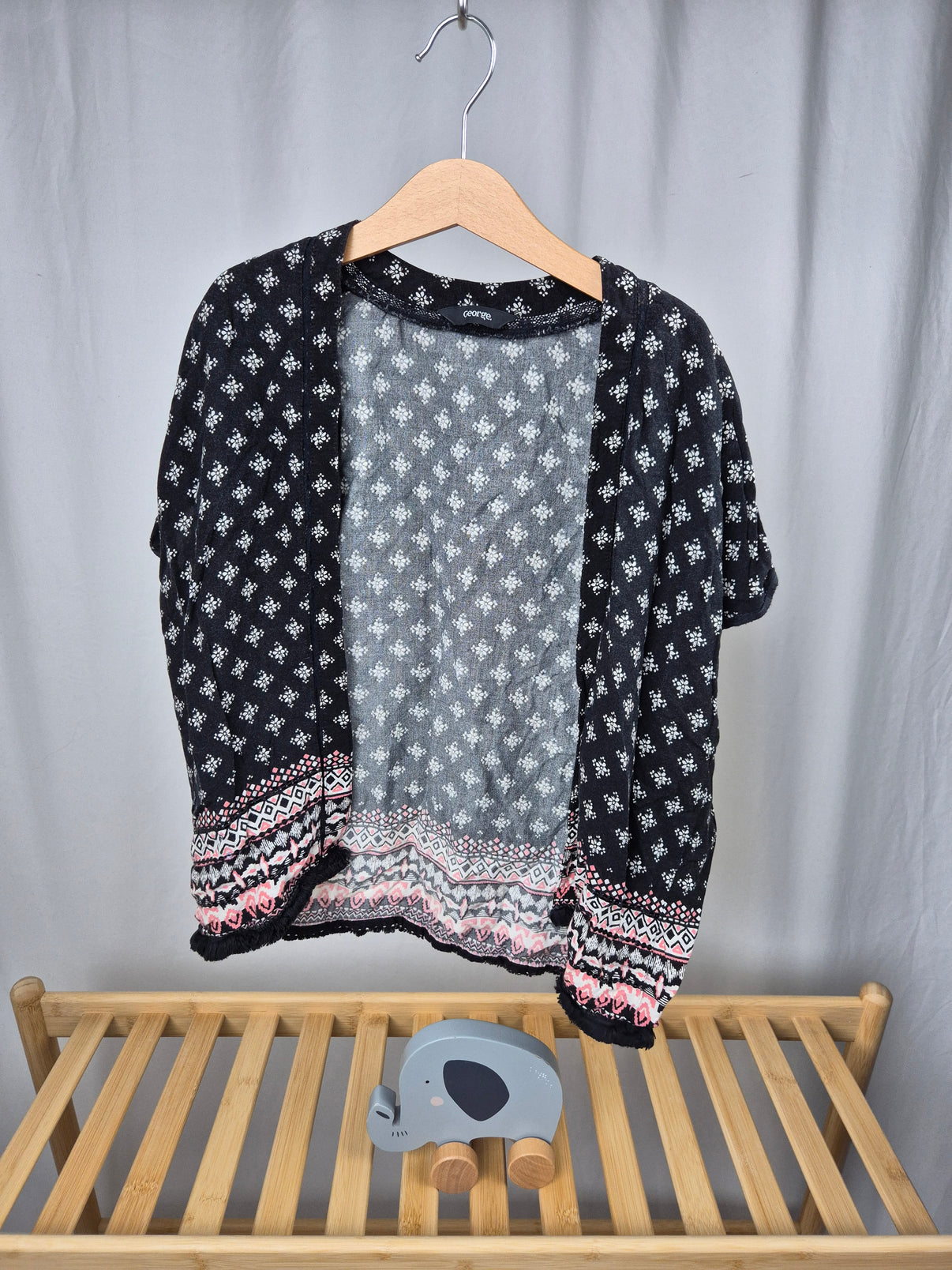 Dívčí kardigan značky George, velikost 116/122. Tmavě modrý základ s jemným bílým vzorem a kontrastním etno lemováním v růžové a bílé barvě. Lehký, bez zapínání, ideální jako přehoz přes tričko nebo šaty. Pohodlný kousek, který dodá outfitu styl a je vhodný na každodenní nošení i do školy.