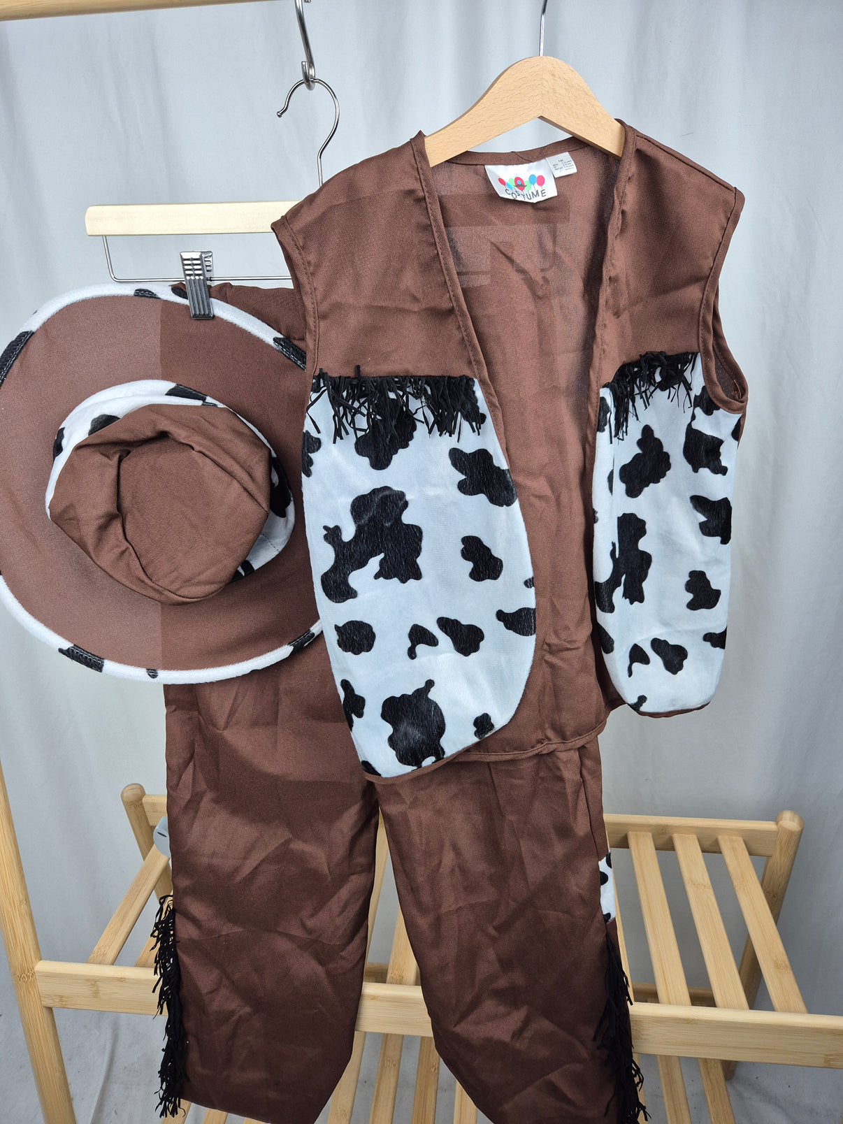 Stylový dětský kostým kovboje nebo kovbojky, ideální na karneval, maškarní bál nebo tematickou oslavu. Set obsahuje hnědé kalhoty s třásněmi, vestu s typickým černo-bílým vzorem „kravských“ skvrn a ladící klobouk. Lehký a pohodlný materiál zajistí volnost pohybu po celý den. Kostým je unisex – padne jak malým kovbojům, tak kovbojkám.