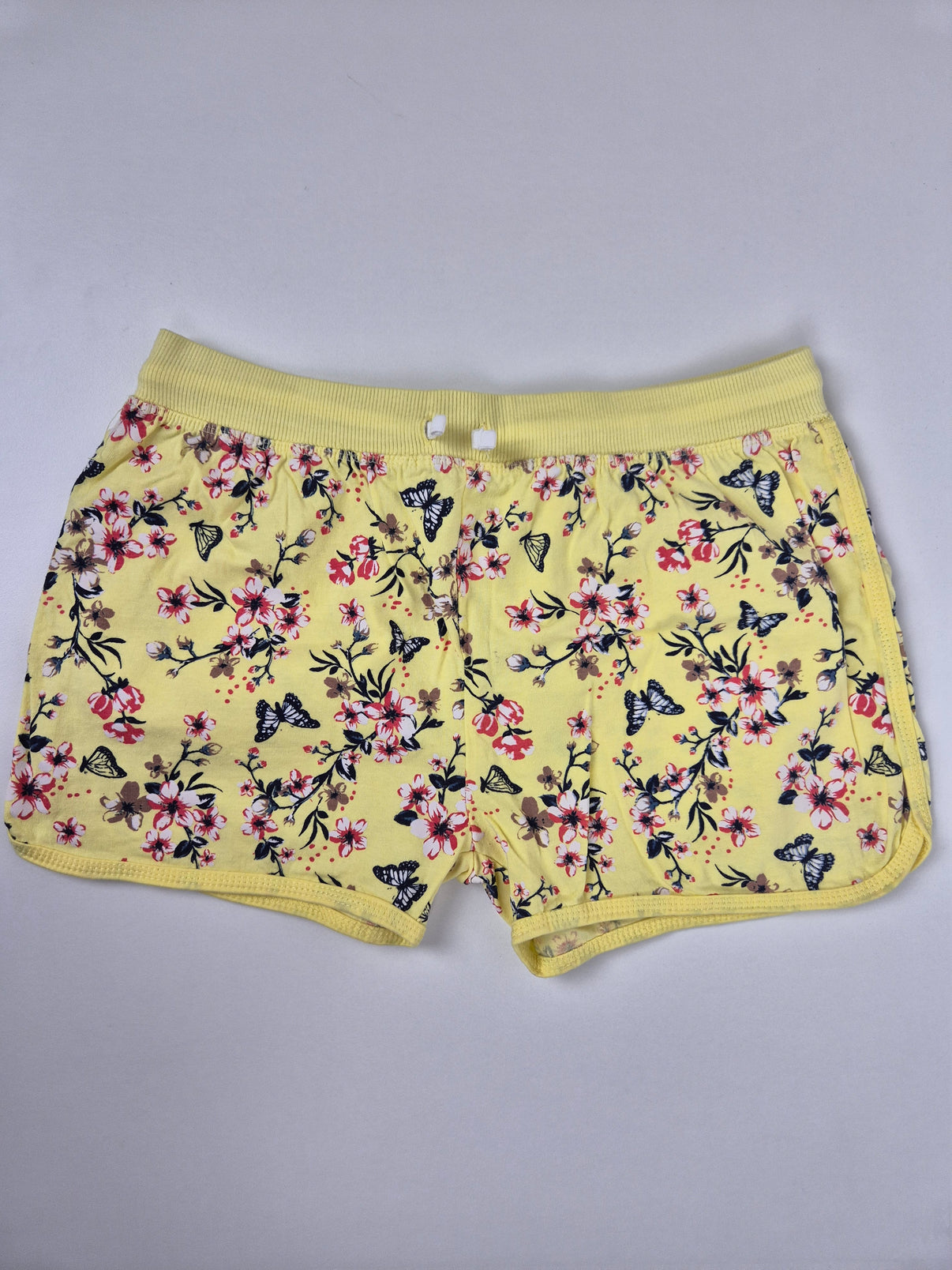 Lehké a pohodlné žluté kraťasy Y.F.K. s krásným květinovým a motýlkovým potiskem. Elastický pas pro pohodlí, příjemný bavlněný materiál ideální na léto.