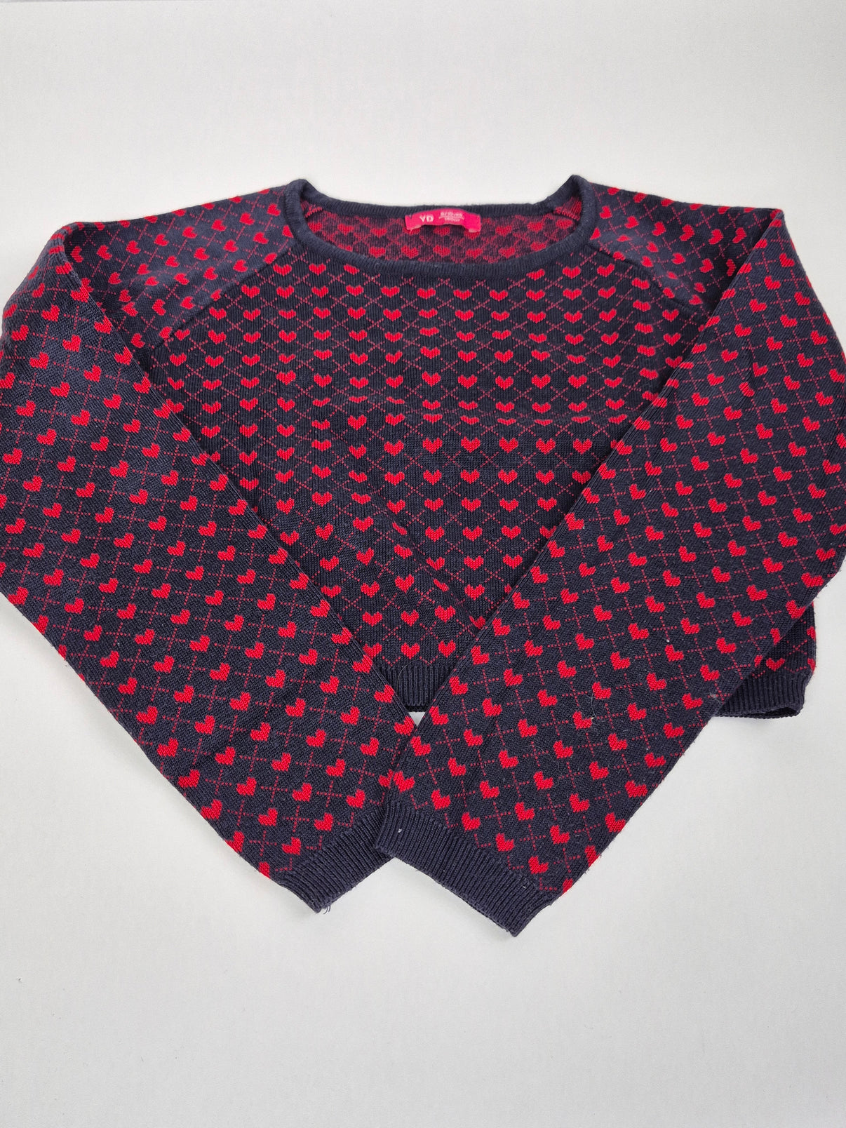 Stylový krátký svetr značky Young Dimension (F&F) ve velikosti 140. Tmavě modrý základ s vpleteným vzorem červených srdíček po celém svetru působí hravě a zároveň elegantně. Vyroben z měkkého, pružného úpletu, který příjemně hřeje a neškrábe. Perfektní pro chladnější dny — ke kalhotám, sukni nebo přes šaty. 💕