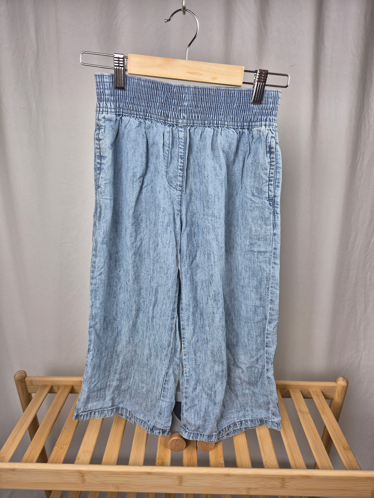 Lehké tříčtvrteční kalhoty značky Next ve velikosti 140 jsou skvělou volbou pro teplé jarní a letní dny. Světle modrý denimový vzhled působí moderně a zároveň ležérně, zatímco široký pružný pas zajišťuje pohodlné nošení bez nutnosti zapínání. Volnější střih nohavic poskytuje dostatek volnosti při pohybu. Ideální kousek pro slečnu na volný čas, výlety i běžné denní nošení.