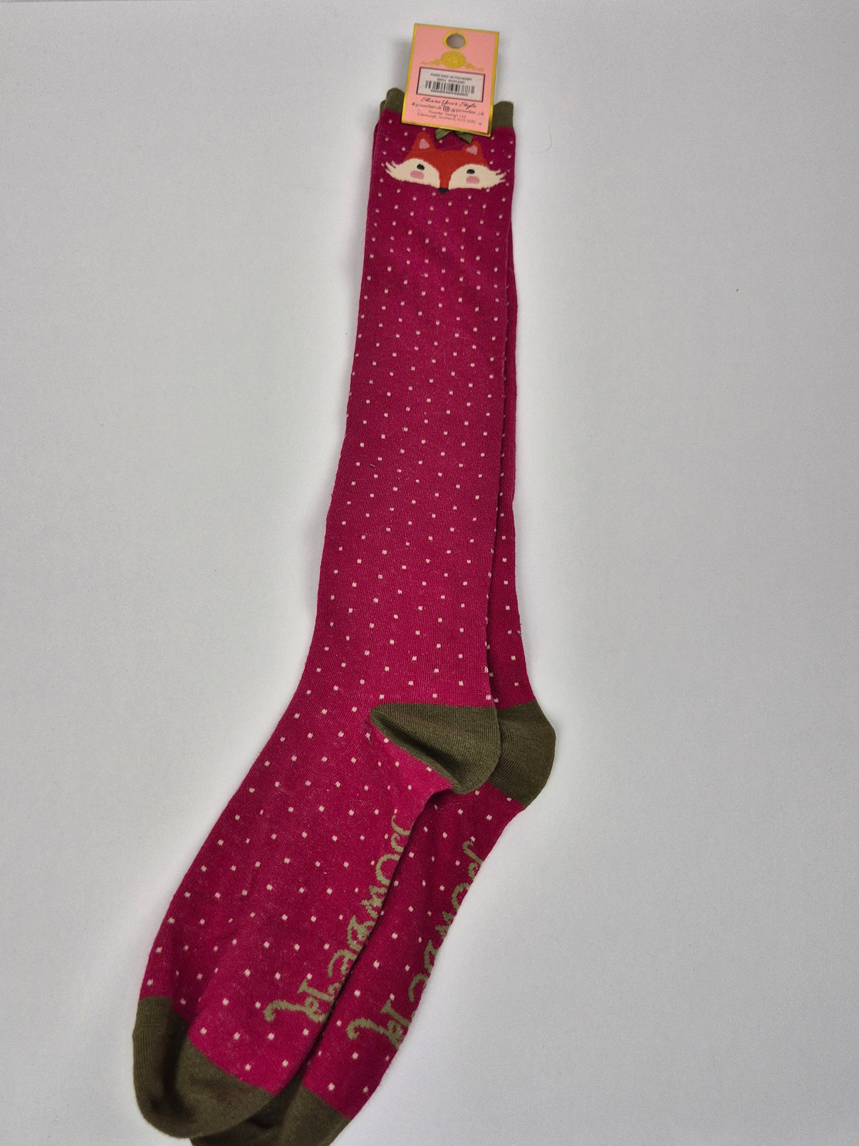 Stylové podkolenky Powder ve velikosti 33/35 jsou ideální pro malé slečny, které mají rády originální doplňky. Vínově růžová barva s jemnými bílými puntíky doplněná o kontrastní khaki patu, špičku a manžetu vytváří hravý, ale elegantní vzhled. Horní část zdobí roztomilý motiv lišky, který dodává podkolenkám šmrnc.