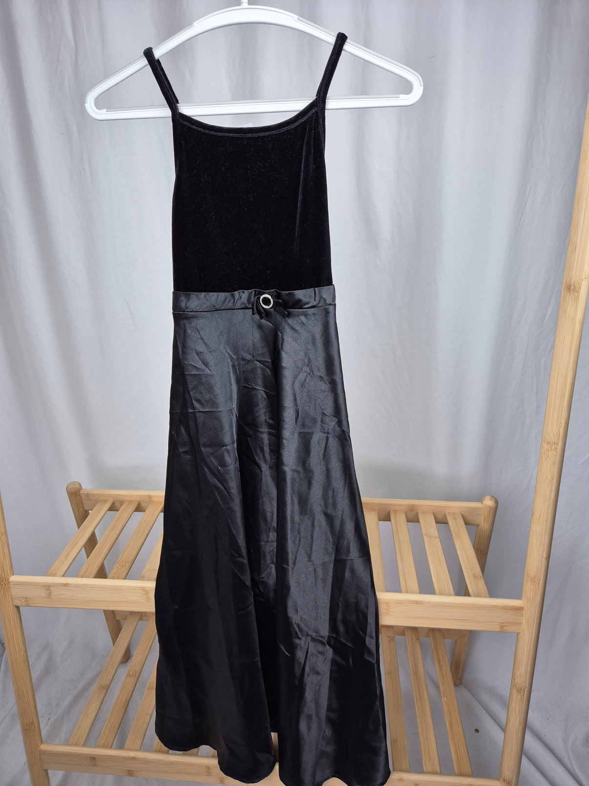 Elegantní dívčí šaty ve velikosti 152, ideální na slavnostní příležitosti. Horní část je z černého sametu s úzkými ramínky, sukně je z lehce lesklého materiálu s jemným páskem a ozdobnou sponou vpředu. Zadní část se zavazuje na mašli, takže šaty krásně drží a přizpůsobí se postavě. Perfektní volba na besídky, oslavy či jiné sváteční události.