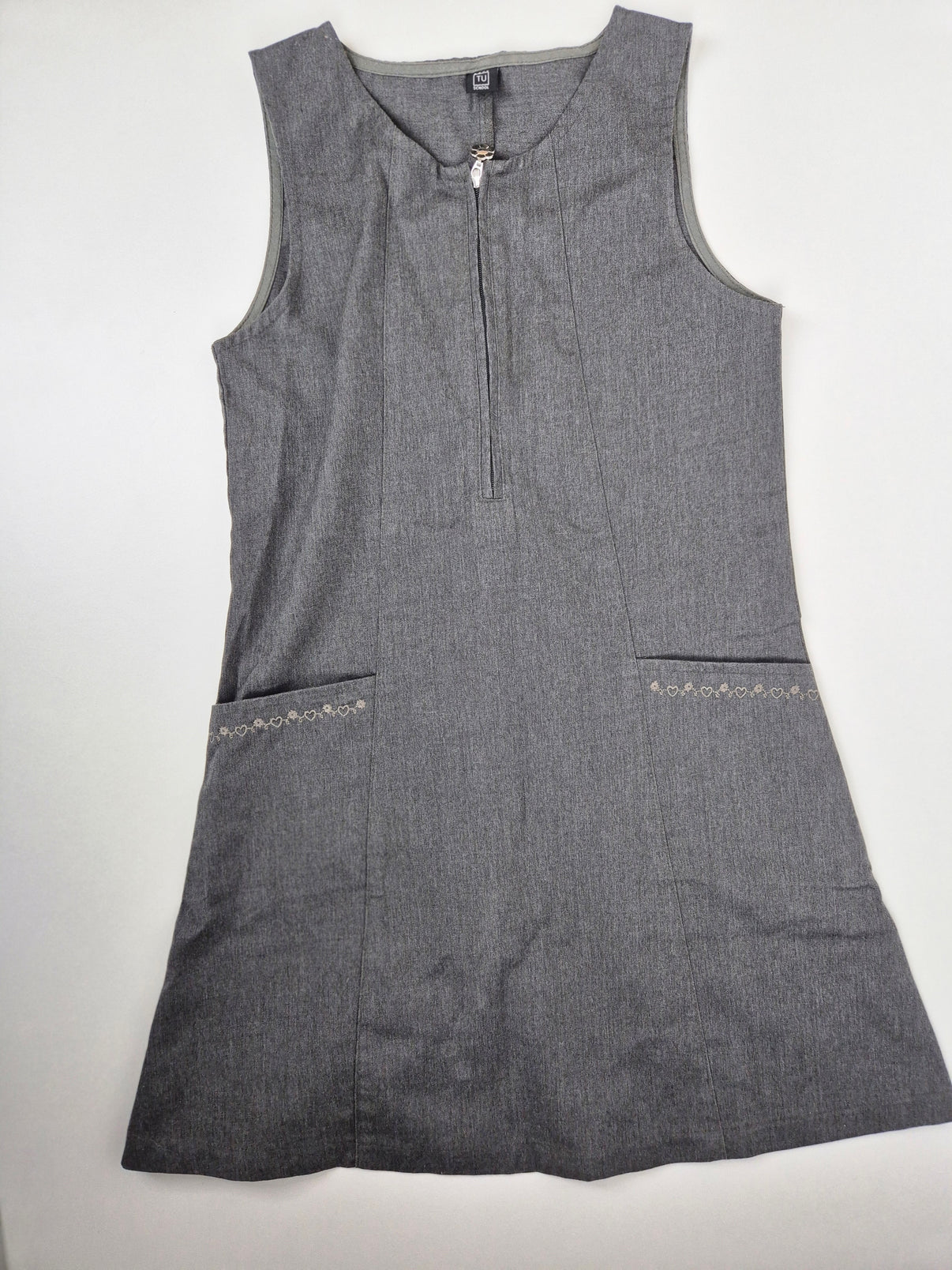 Elegantní šedé šaty Tu bez rukávů, ideální pro školní dny či slavnostní příležitosti. Mají praktický zip u výstřihu pro snadné oblékání a dvě přední kapsy zdobené jemnou výšivkou. Střih je mírně rozšířený do A, což zajistí pohodlí při pohybu i celý den ve škole. Příjemný materiál drží tvar a snadno se udržuje. Určeno pro holčičku.