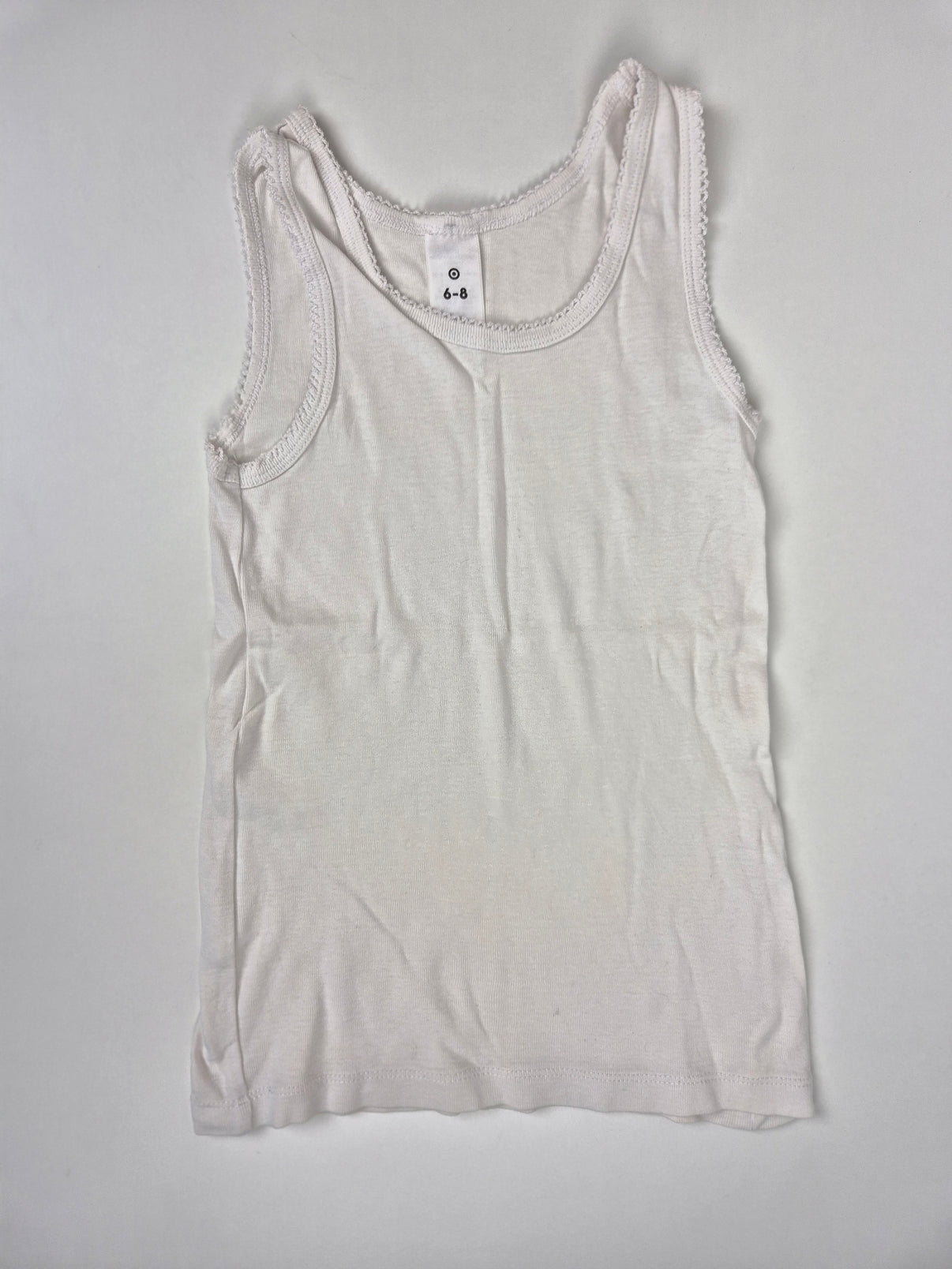 Dívčí tílko ve velikosti 116/128 v jednoduchém bílém provedení s jemným ozdobným lemem kolem výstřihu a rukávků. Skvěle poslouží jako spodní vrstva pod svetr nebo mikinu, ale i samostatně v teplých dnech. Pohodlný střih a příjemný materiál zajistí komfort při každodenním nošení.