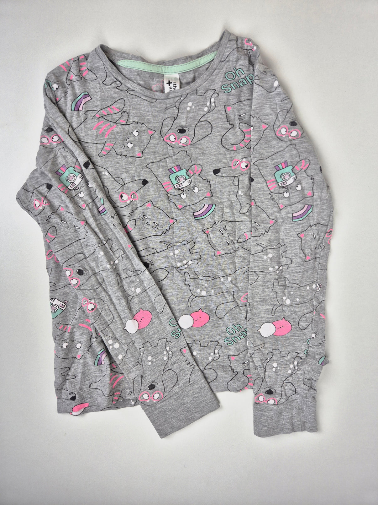 Dívčí tričko značky C&A ve velikosti 152 v šedé barvě s veselým celoplošným potiskem zvířátek a nápisy. Má dlouhý rukáv a pohodlný střih, který se hodí jak do školy, tak i na volný čas. Barevné detaily v růžové a tyrkysové dodávají tričku hravý vzhled.
