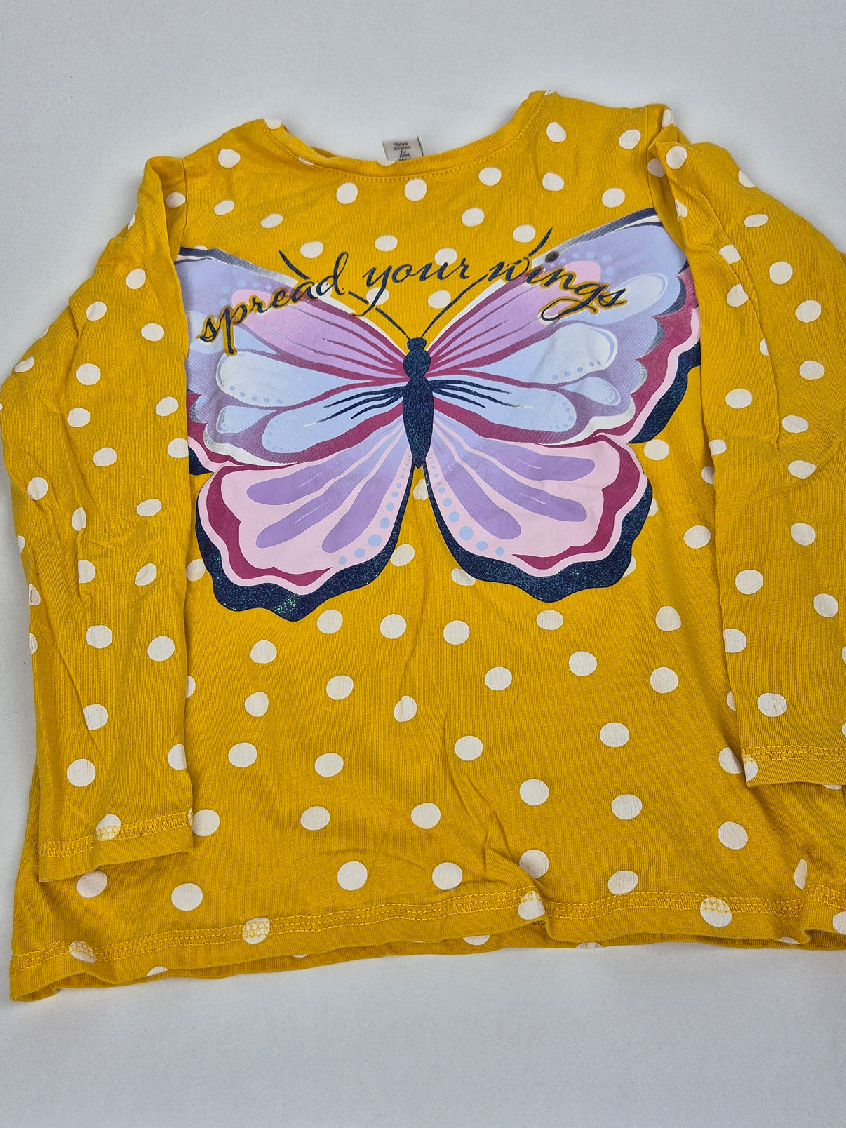 Veselé tričko značky Dopodopo s dlouhým rukávem v zářivém hořčicově žlutém odstínu s bílými puntíky. Na přední straně upoutá pozornost velký barevný motýl s nápisem „spread your wings“, který dodává tričku optimistický a hravý vzhled. Díky příjemné bavlněné látce je ideální pro běžné nošení do školy i na volný čas. Krásný a pohodlný kousek pro holky, které milují barvy a motýlky.