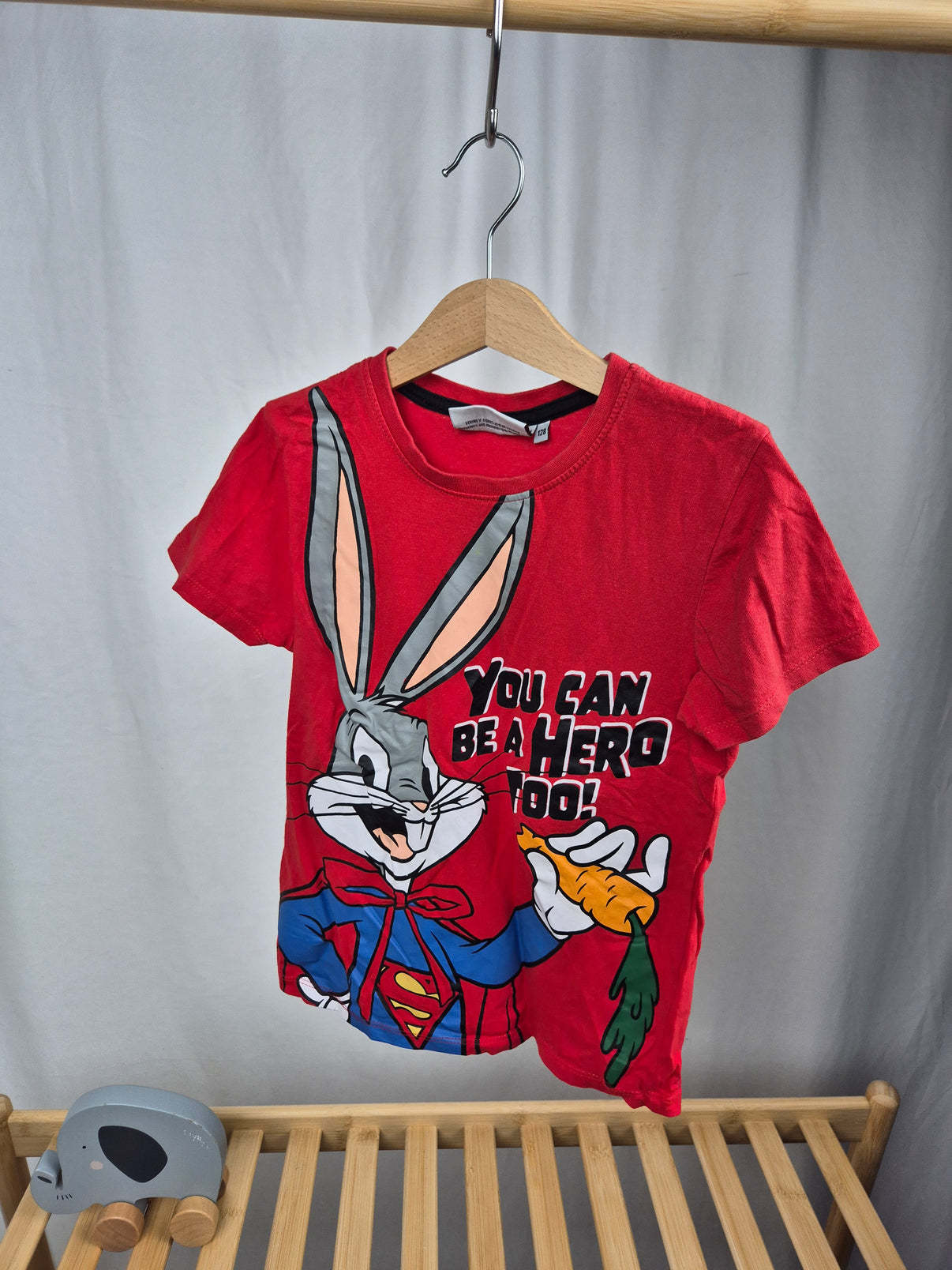 Veselé chlapecké tričko Looney Tunes z kolekce Pepco s krátkým rukávem. Červené tričko s výrazným potiskem legendárního zajíce Bugs Bunnyho převlečeného za Supermana a nápisem „You can be a hero too!“. Vyrobené z měkké, prodyšné bavlny, ideální na každodenní nošení, do školy nebo na doma.
