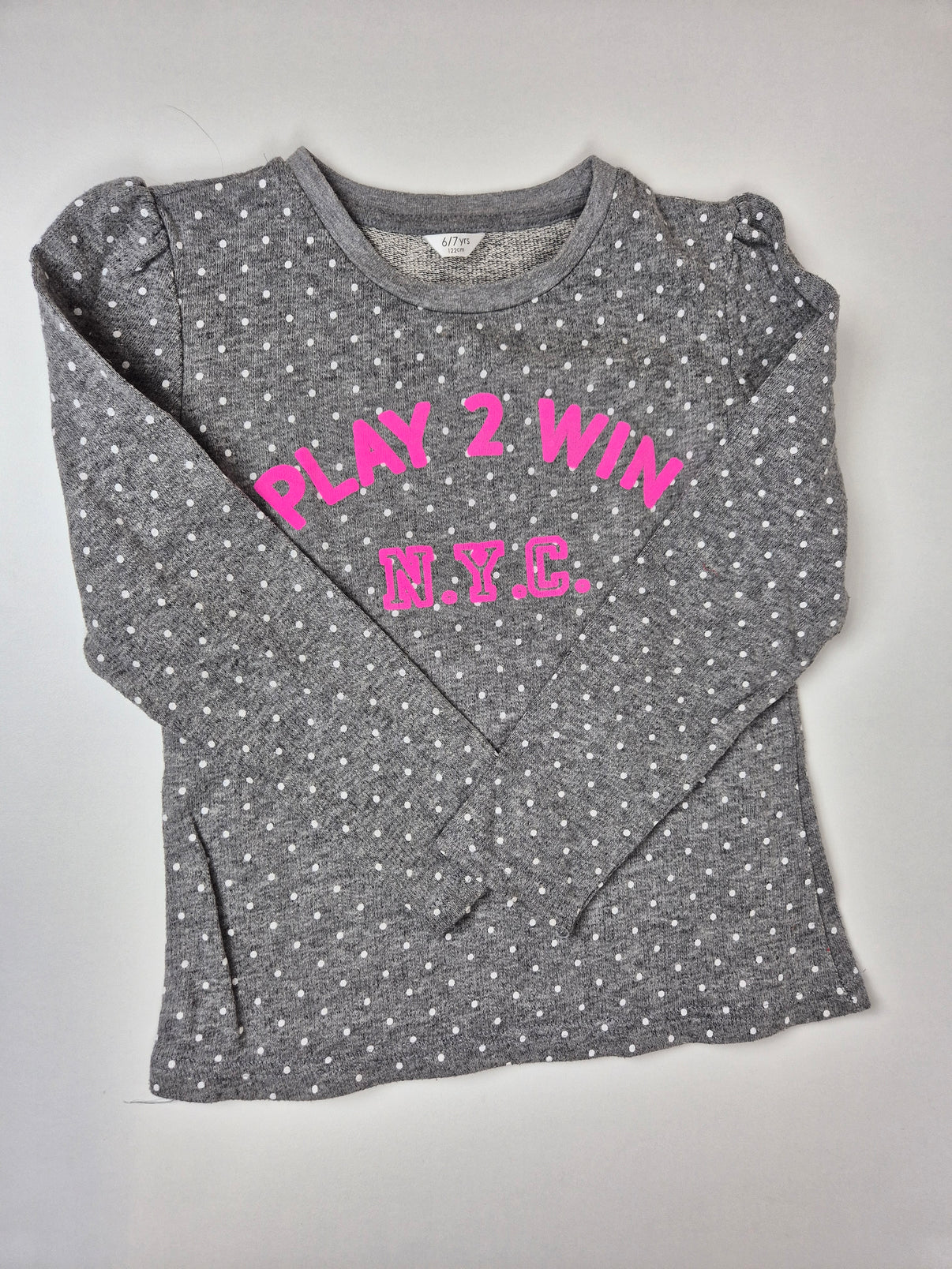 Šedé tričko Pepco s bílými mini puntíky je pohodlný a univerzální kousek pro každodenní nošení. Růžový nápis PLAY 2 WIN – N.Y.C. dodává tričku sportovní a moderní nádech, zatímco jemně řasená ramínka působí lehce holčičím dojmem. Příjemný úplet se dobře nosí do školy, na hřiště i doma.
