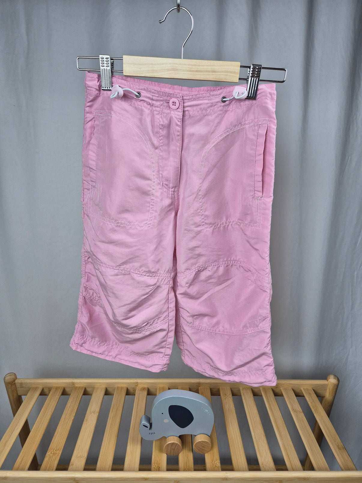 Pohodlné tříčtvrteční kalhoty značky C&A ve velikosti 140 v jemně růžové barvě jsou skvělou volbou pro aktivní dívku. Kalhoty mají praktické kapsy vpředu i vzadu, lehce zúžené nohavice a možnost stažení v pase díky šňůrkám. Prošívání na nohavicích jim dodává sportovní vzhled. Lehký a prodyšný materiál zajistí pohodlí při nošení během jarních a letních dobrodružství. Skvělý kousek na hřiště, výlety i volný čas.