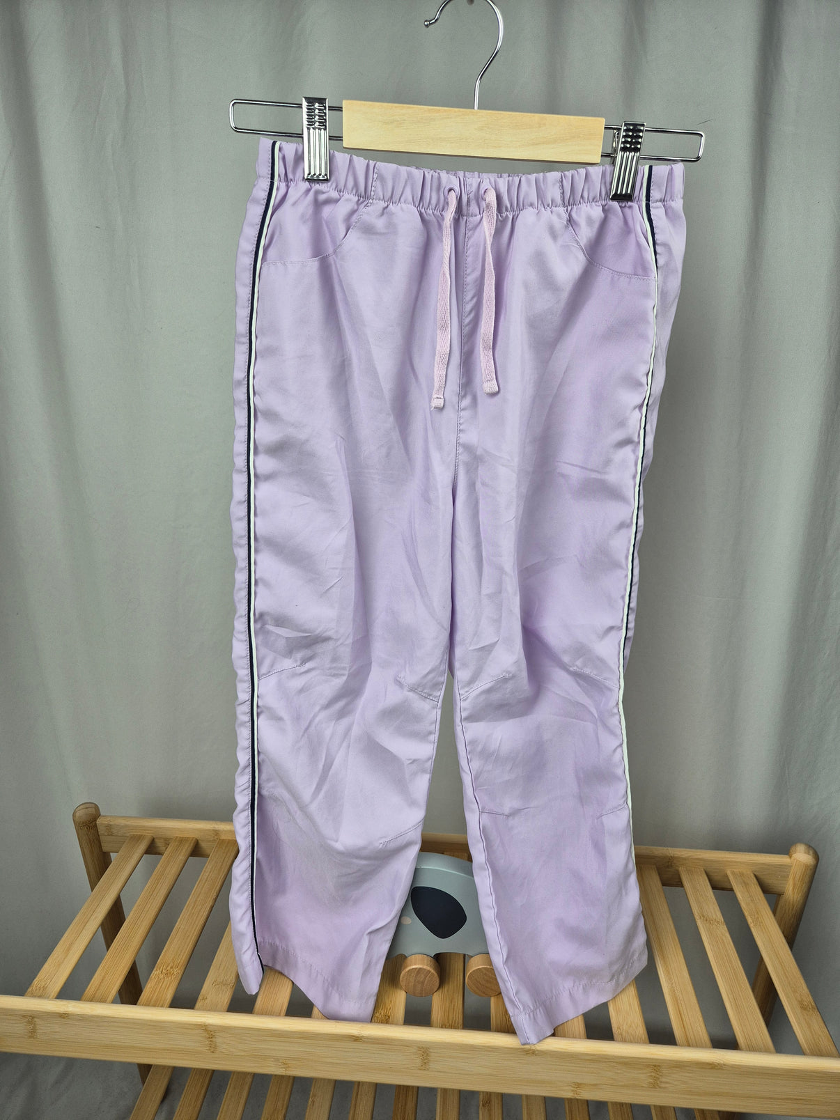 Pohodlné tříčtvrteční kalhoty značky George ve velikosti 134/140 v jemném světle fialovém odstínu jsou ideální volbou na sport i volný čas. Pružný pas se šňůrkou zaručuje pohodlné nošení, boční černobílý proužek dodává kalhotám moderní sportovní vzhled. Lehký materiál je vhodný na jaro a léto, ať už do školy, na kroužky nebo na hřiště. Stylový kousek pro dívku, která má ráda pohodlí a pohyb.