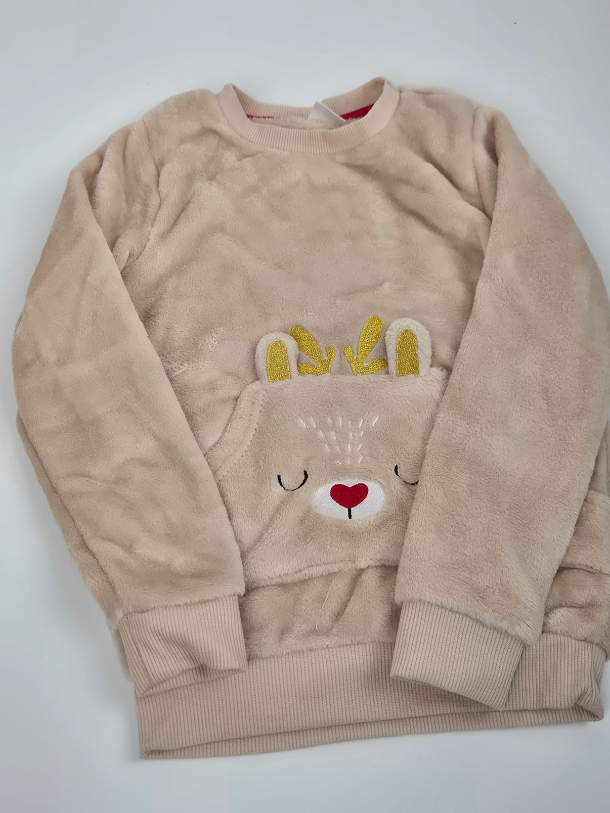 Heboučká vánoční mikina pro holčičku ve světlounce béžové barvě s roztomilým motivem spícího sobíka a třpytivými zlatými oušky a parůžky. Příjemný fleecový materiál hřeje a je jako stvořený na zimní dny doma i do školky. Praktická klokanka v přední části a žebrované náplety zajišťují pohodlí při nošení. Stylový a hravý kousek z Pepca, který doladí sváteční atmosféru.