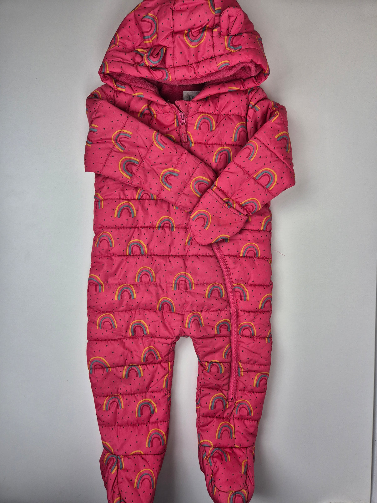 Veselá a výrazná zimní kombinéza v sytě růžové barvě s celoplošným potiskem duhových oblouků a drobných puntíků. Barevnost je hravá, ale stále příjemná na pohled – růžový základ doplňují duhy v odstínech žluté, oranžové a fialové. Kombinéza je bohatě prošívaná, takže dobře zahřeje, a uvnitř má měkkou hřejivou podšívku.
