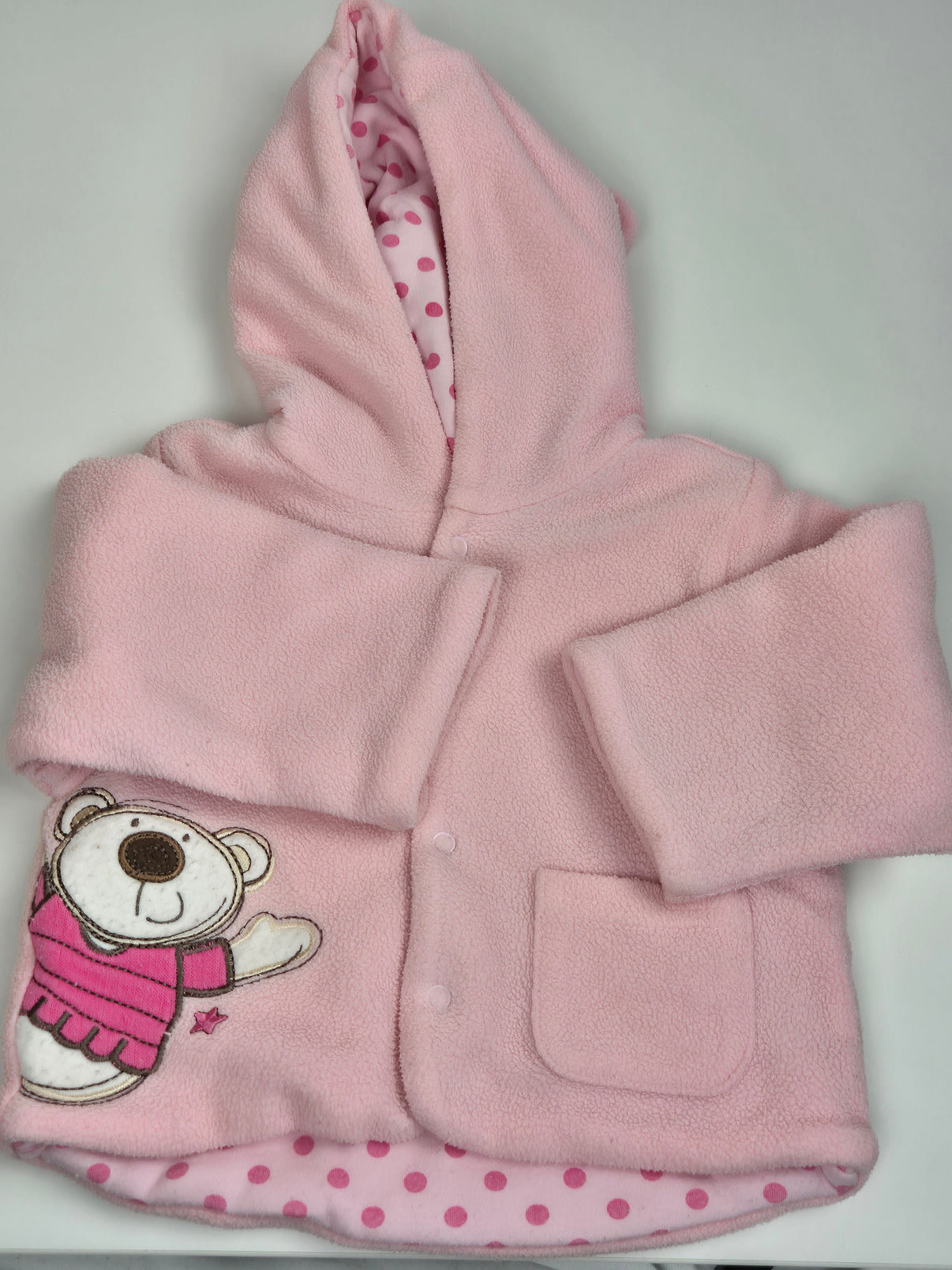 Měkoučká růžová mikina z fleecu s kapucí, ideální pro chladnější dny. Roztomilá nášivka medvídka na přední straně a puntíkovaná podšívka kapuce dodávají mikině hravý vzhled. Zapínání na druky usnadňuje oblékání, praktická kapsa vpředu. Vhodná hlavně pro holčičku – do kočárku, na procházky i na doma.