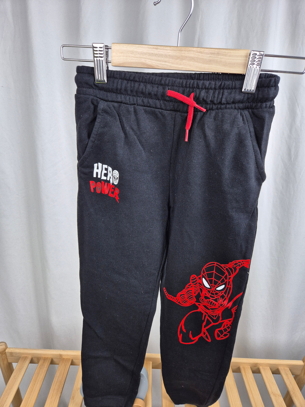 Černé tepláky s červeným potiskem Spidermana na nohavici a nápisem „Hero Power“.
