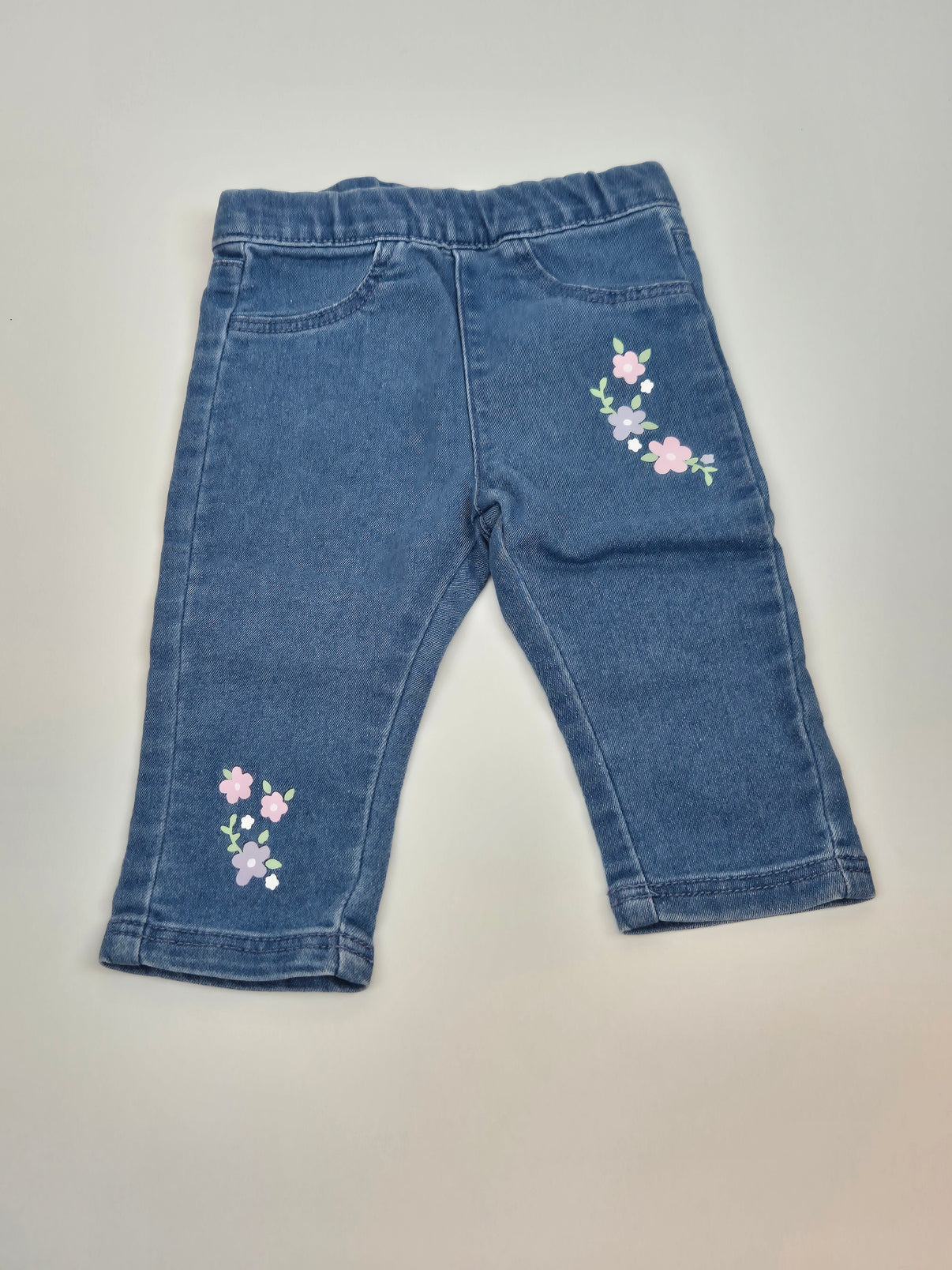 Stylové modré džegíny pro holčičky ve velikosti 74, které kombinují vzhled klasických riflí s pohodlím legín. Pružný pas zajistí pohodlné oblékání i nošení. Přední stranu zdobí jemné květinové potisky v pastelových barvách, které dodávají outfitu hravý a roztomilý vzhled. Skvělé do školky, na procházky i každodenní nošení.
