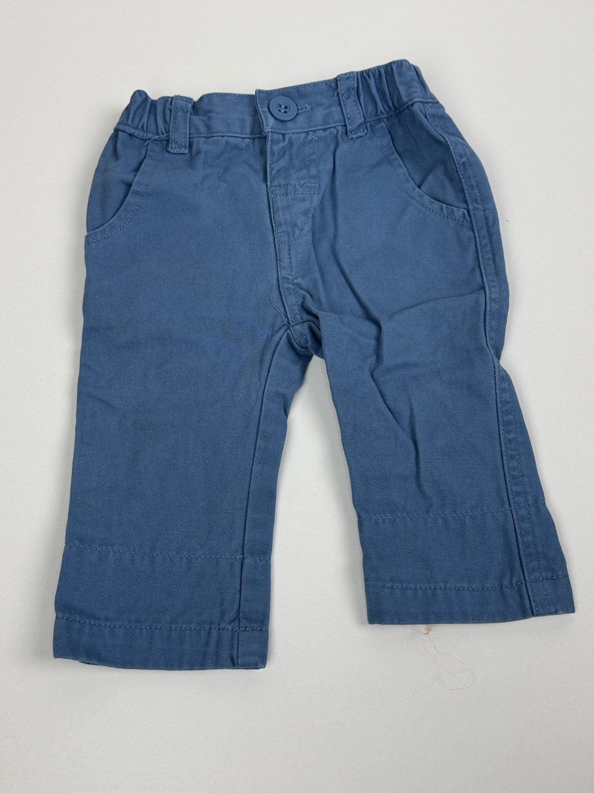 Jednoduché modré kalhoty značky Early Days z měkké bavlny s příměsí elastanu pro větší pohodlí při pohybu. Mají klasický střih s kapsami vpředu i vzadu, zapínání na knoflík a pružný pas, který se přizpůsobí postavě dítěte. Ideální volba pro běžné nošení, na návštěvy i do kočárku – univerzální a pohodlný kousek.
