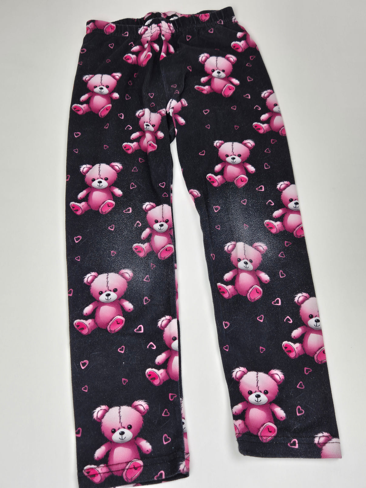 Hebké legíny z měkkého úpletu v tmavém tónu s roztomilým celoplošným motivem růžových medvídků a drobných srdíček. Příjemný pružný pas zajistí pohodlí po celý den – ideální volba na doma, do školky i na hravé venkovní dobrodružství. Vzor i barevnost působí spíše holčičím dojmem, ale klidně potěší i každé dítě, které miluje medvídky.