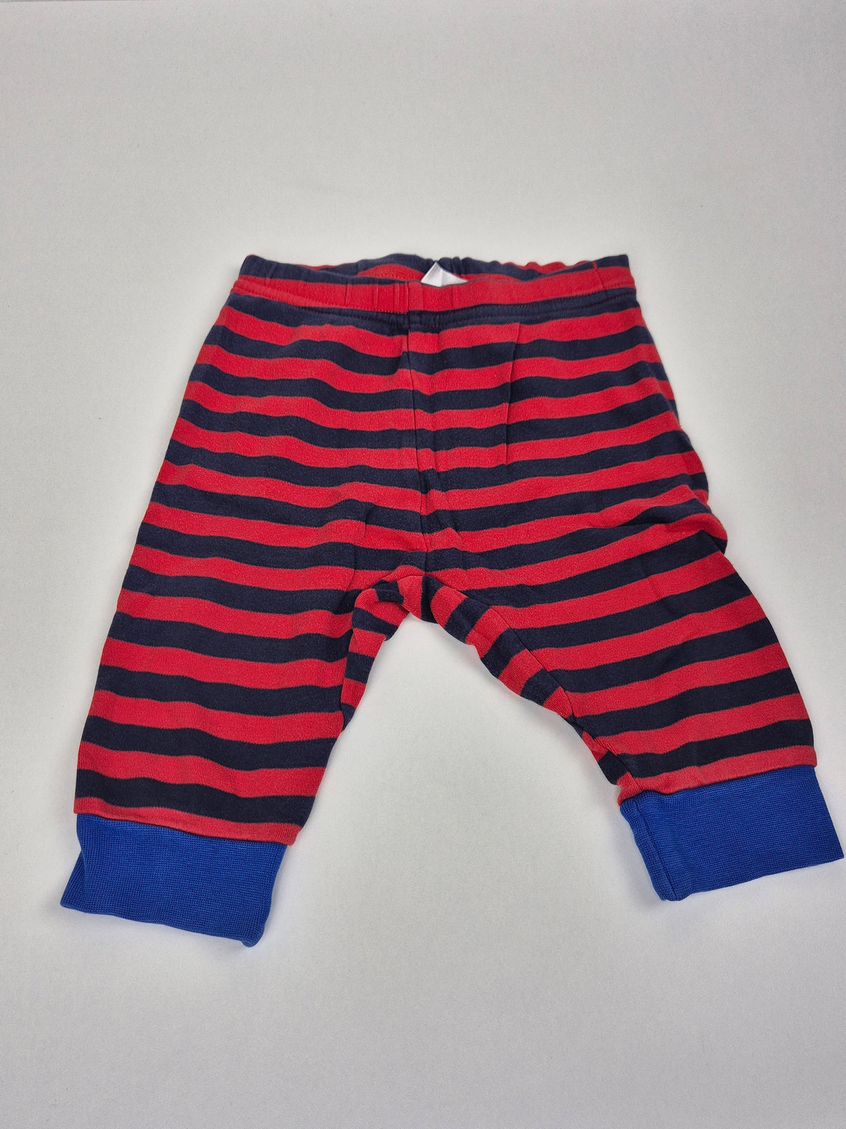 Pohodlné bavlněné legíny Next ve velikosti 80 jsou ideální pro nejmenší děti. Mají roztomilý pruhovaný vzor v červené a tmavě modré barvě, doplněný o modré náplety na nohavicích, které pomáhají legínám hezky držet tvar. Díky měkkému a pružnému materiálu se snadno oblékají a nikde netlačí – skvělé na hraní, spánek i každodenní nošení.