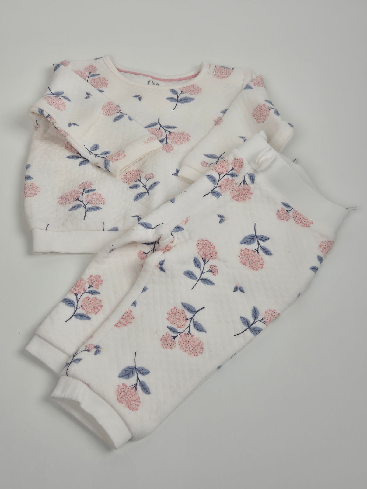 Roztomilá tepláková souprava od značky C&A ve velikosti 74 je ideální volbou pro malé parádnice. Měkký, prošívaný materiál v jemně smetanovém tónu zdobí něžný květinový vzor v růžové a modré...