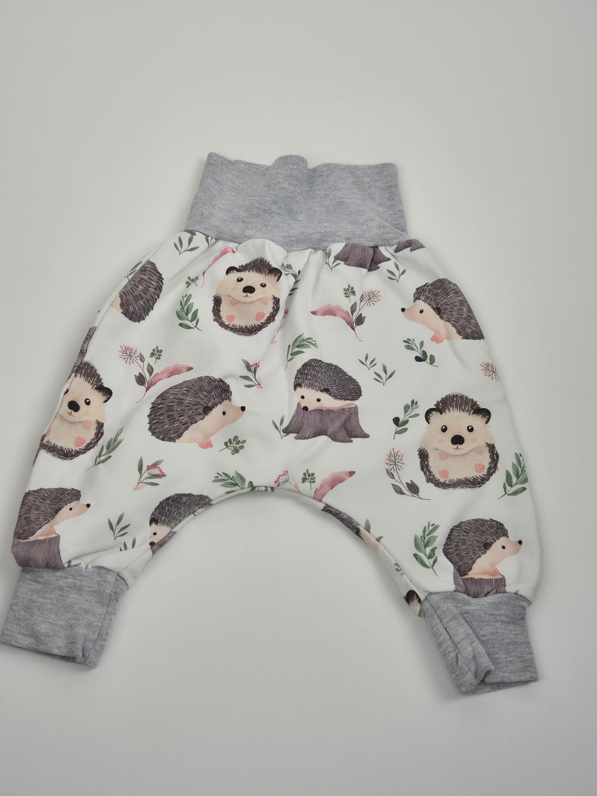 Pohodlné tepláčky z české malovýroby ve velikosti 62, ideální pro miminka od narození do cca 3 měsíců. Bílý podklad zdobí něžný potisk veselých ježečků a jemných lístků, který potěší každé malé zvídavé očko. Šedé náplety v pase i na nohavicích jsou pružné a zároveň příjemně měkké – perfektní pro pohodlné nošení doma i na procházce. Unisex provedení pro holčičky i chlapečky.