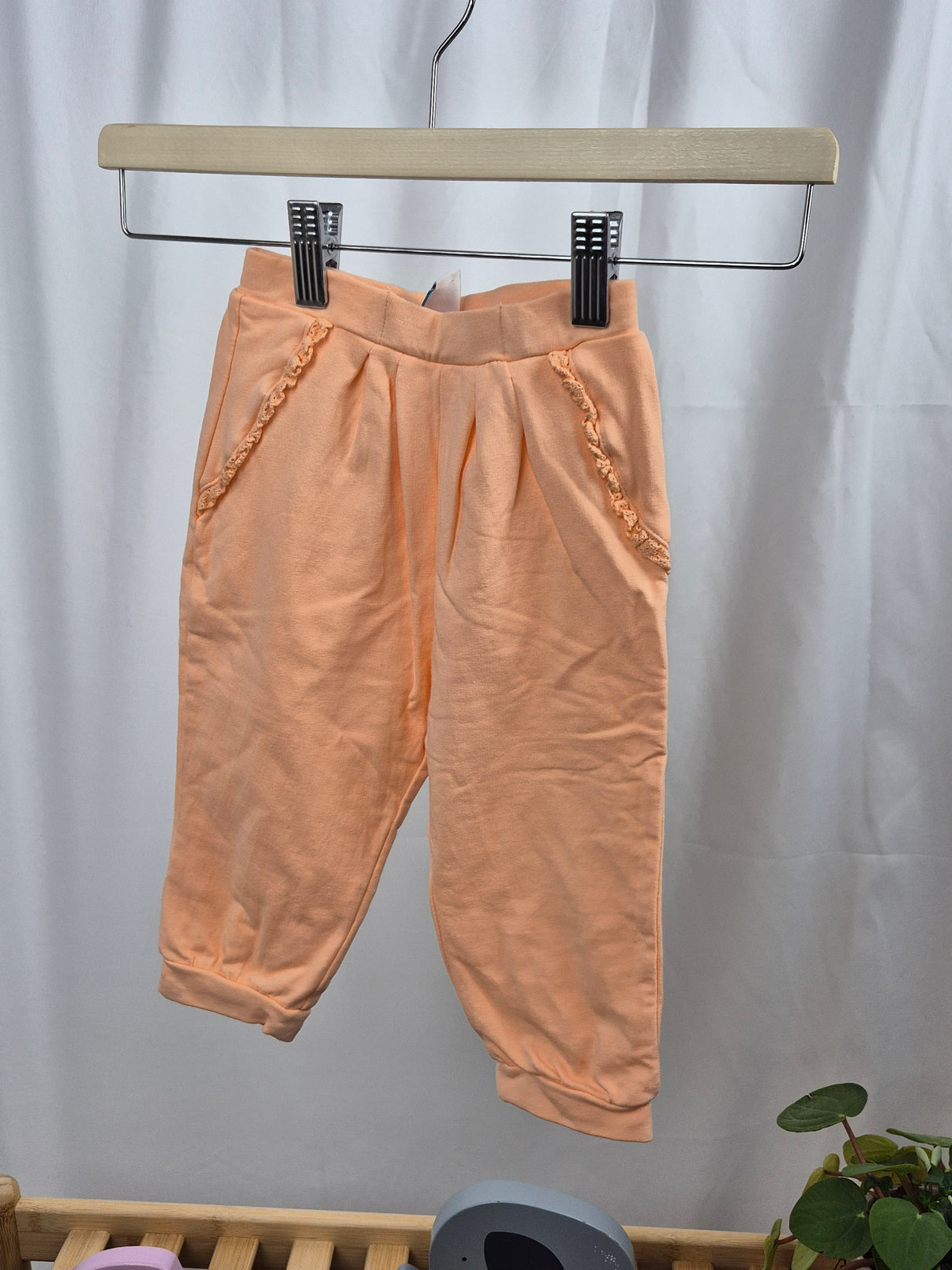 Jemně meruňkové tepláčky značky Topomini jsou krásným a pohodlným kouskem pro malé parádnice. Mají elegantní sklady v přední části a kapsičky ozdobené drobnou krajkou, což jim dodává něžný vzhled. Pružný pas a zakončení nohavic do měkké manžety zaručí pohodlí při každodenním nošení – ideální volba do školky, na hřiště nebo pro chvíle doma.