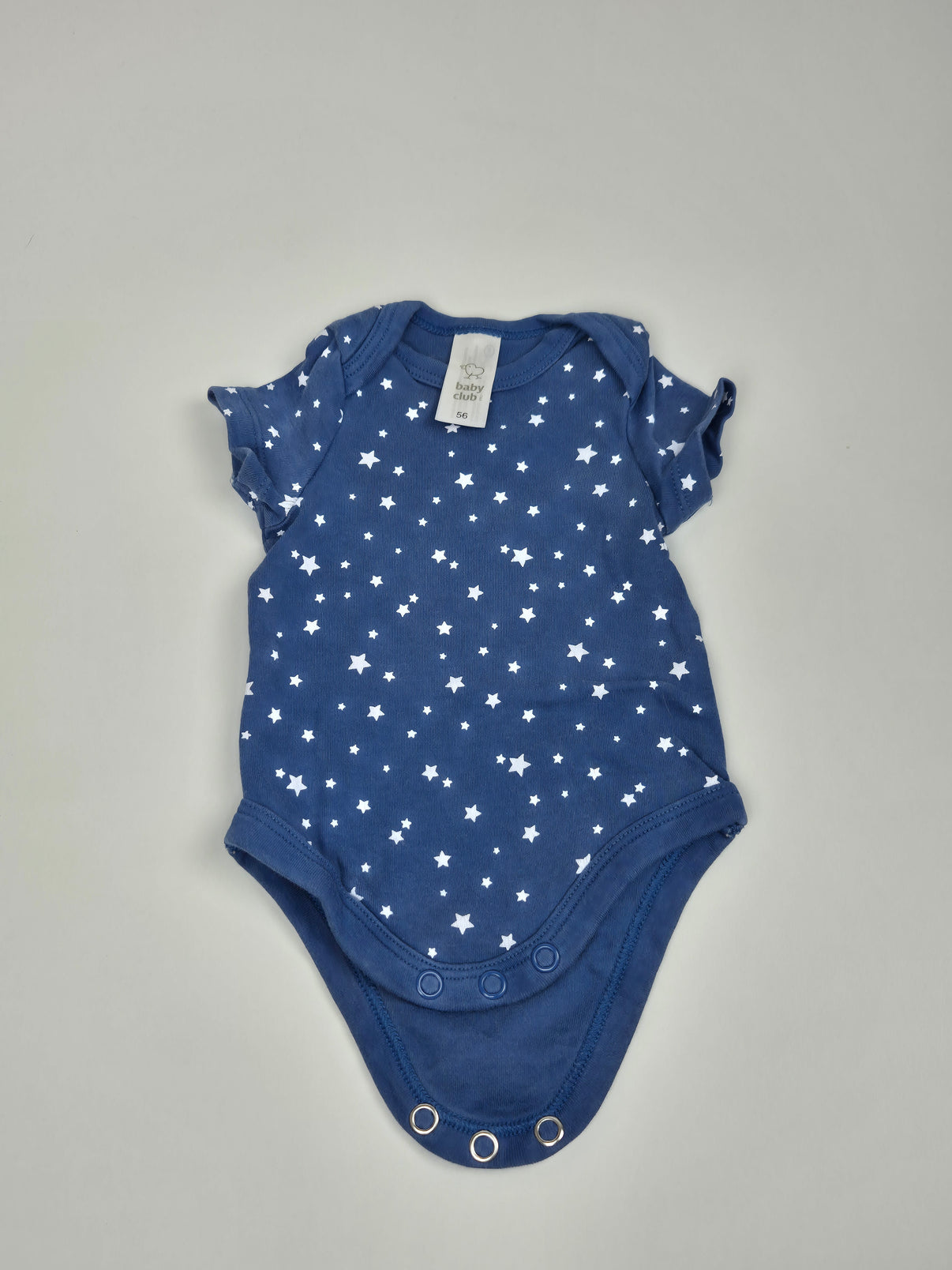 Pohodlné bavlněné body značky Baby Club od C&A v tmavě modré barvě s jemným potiskem bílých hvězdiček. Ideální volba pro každodenní nošení – příjemné na dotek, skvěle drží tvar a neomezuje pohyb miminka.