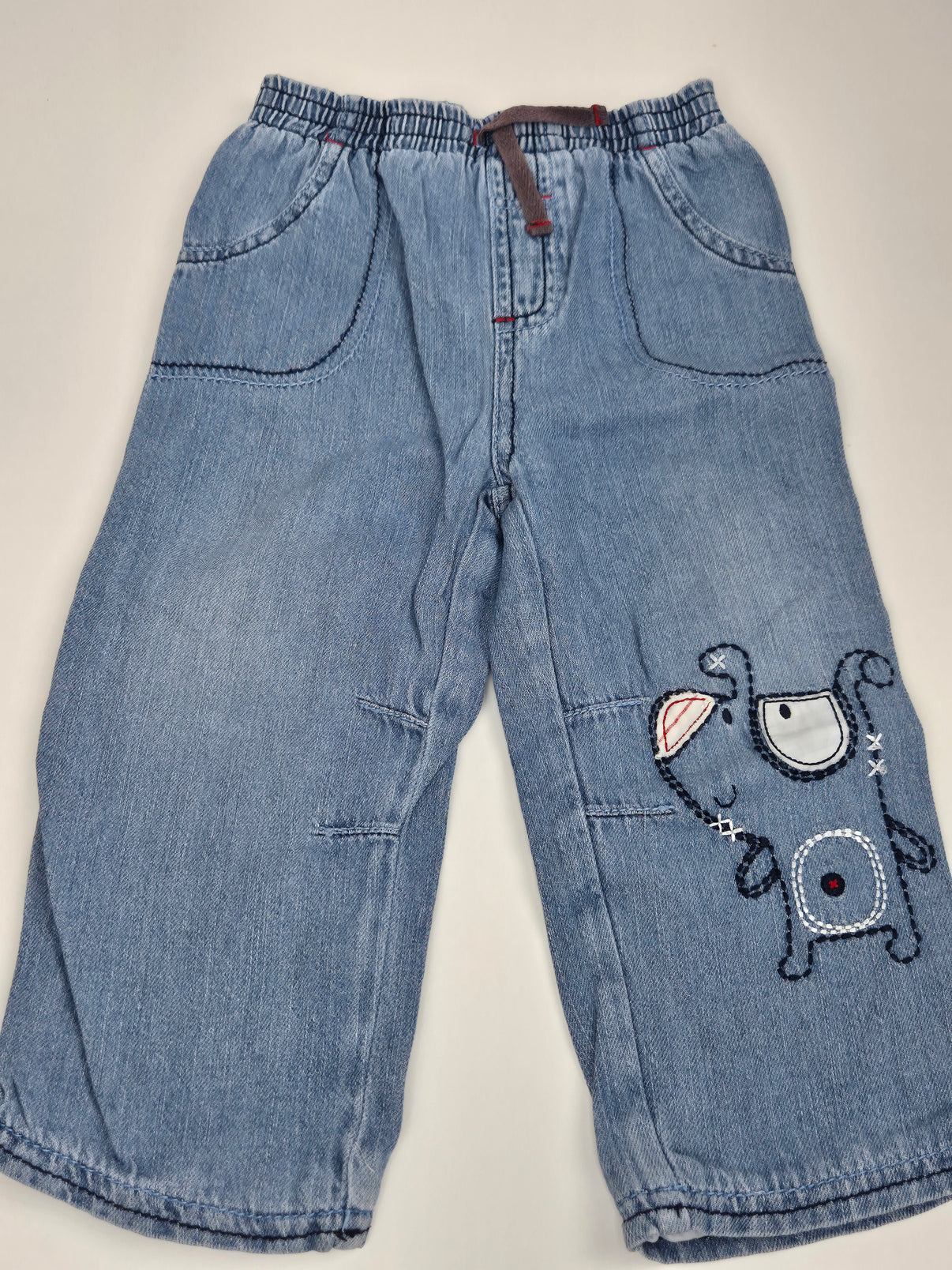 Pohodlné džínové kalhoty George s pružným pasem a veselou výšivkou pejska. Měkký a prodyšný materiál umožňuje volný pohyb, ideální na hraní i procházky. Praktický kousek do každodenní výbavy malého kluka.