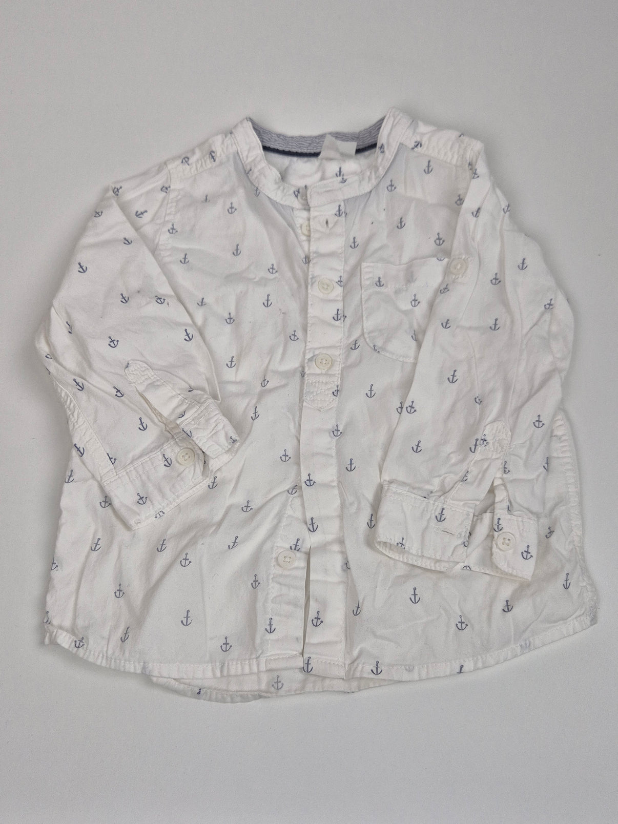 Lehká bavlněná košile H&M v bílé barvě s jemným námořnickým vzorem kotviček. Stojáček a zapínání na knoflíčky dodávají elegantní, ale přitom ležérní vzhled. Ideální na běžné nošení, oslavy i focení...