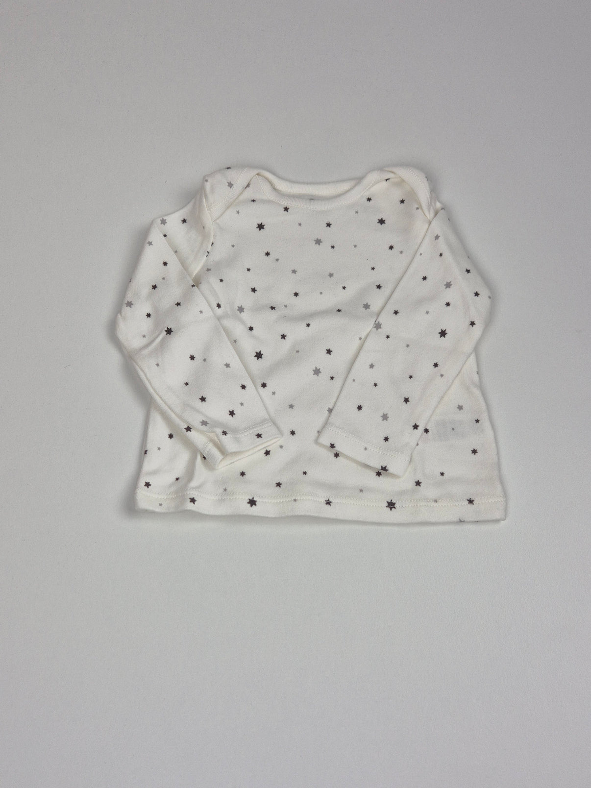 Jemné smetanově bílé tričko s dlouhým rukávem značky F&F s drobným hvězdičkovým vzorem v šedých a tmavších tónech. Minimalistický, nadčasový design se snadno kombinuje s legínami, tepláčky i pod mikinu. Měkký bavlněný materiál je příjemný na nošení a ideální pro každodenní použití doma, do kočárku i na návštěvy. Praktický střih usnadňuje oblékání a je pohodlný i pro ty nejmenší. Univerzální kousek vhodný pro holčičku i kluka.