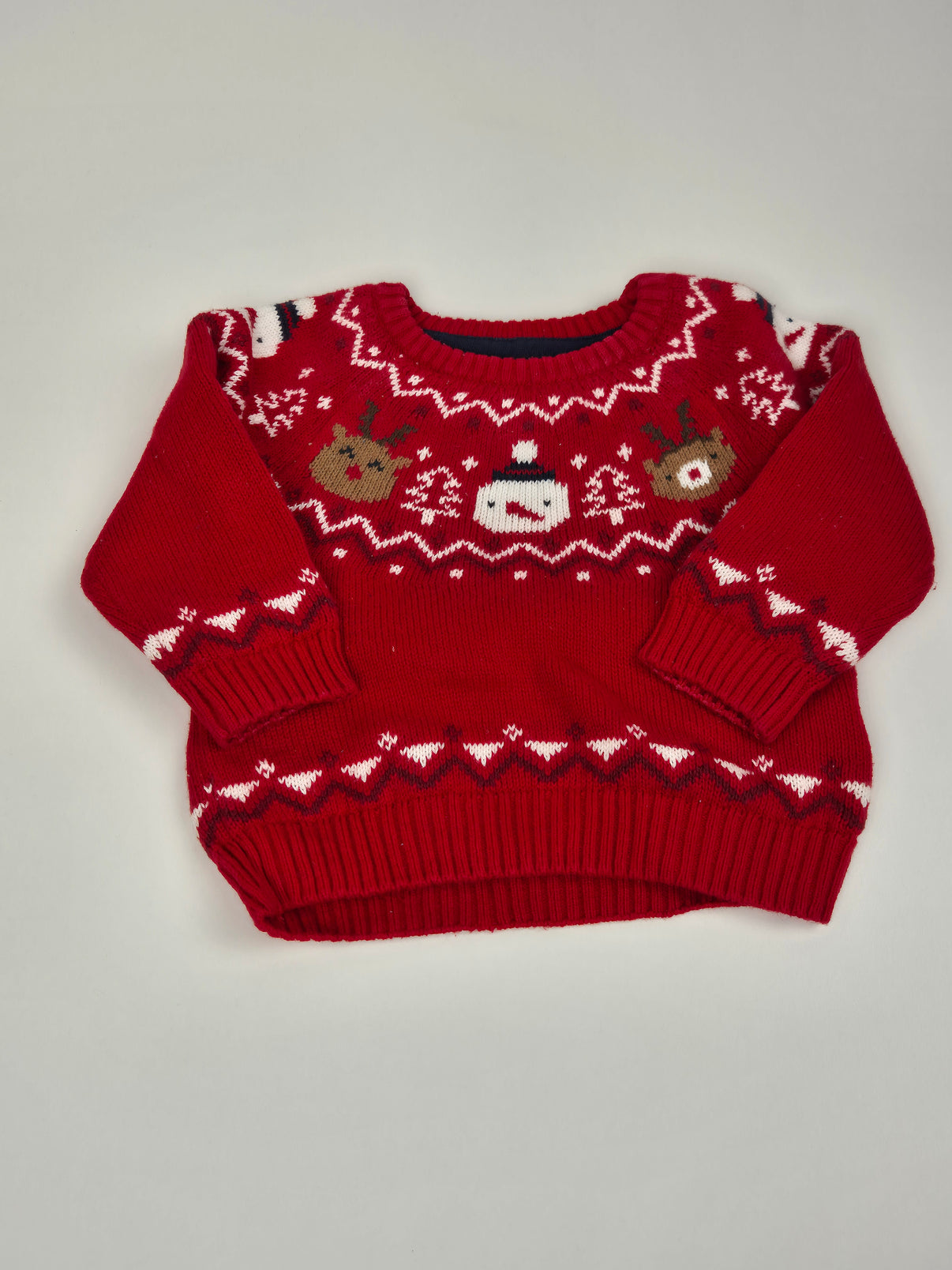 Roztomilý vánoční svetr značky C&A Baby v červené barvě s veselým zimním motivem sobíků a vloček. Měkoučký materiál příjemný na nošení udrží malé prcky v teple a pohodlí. Skvělý kousek na vánoční sezónu i jako dárek pod stromeček.