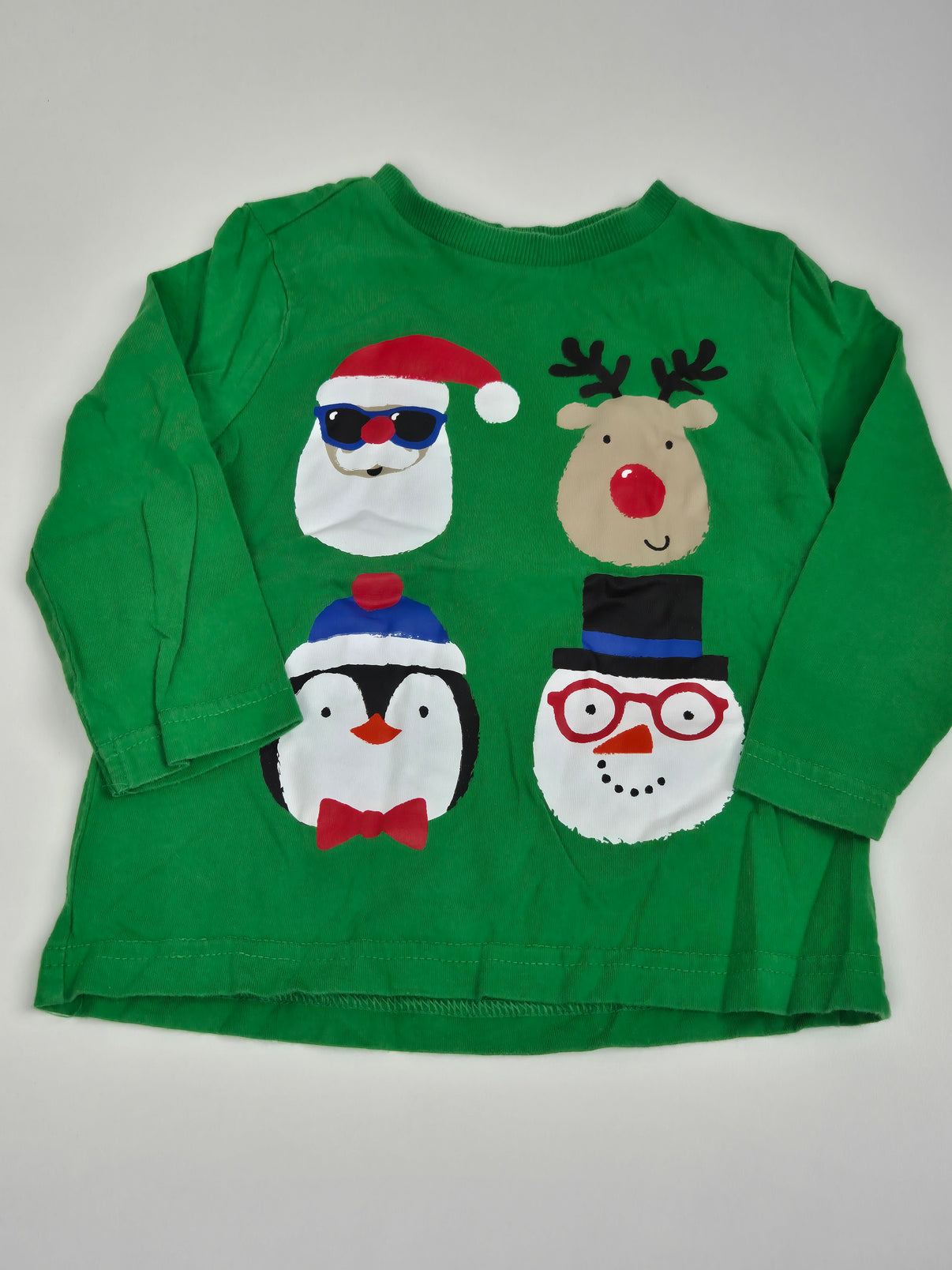 Roztomilé vánoční tričko F&F v zelené barvě s potiskem Santu, sobíka, tučňáka a sněhuláka. Příjemný bavlněný materiál je pohodlný na nošení, ideální pro vánoční focení i sváteční rodinné chvíle. Skvělý kousek pro malé vánoční nadšence.