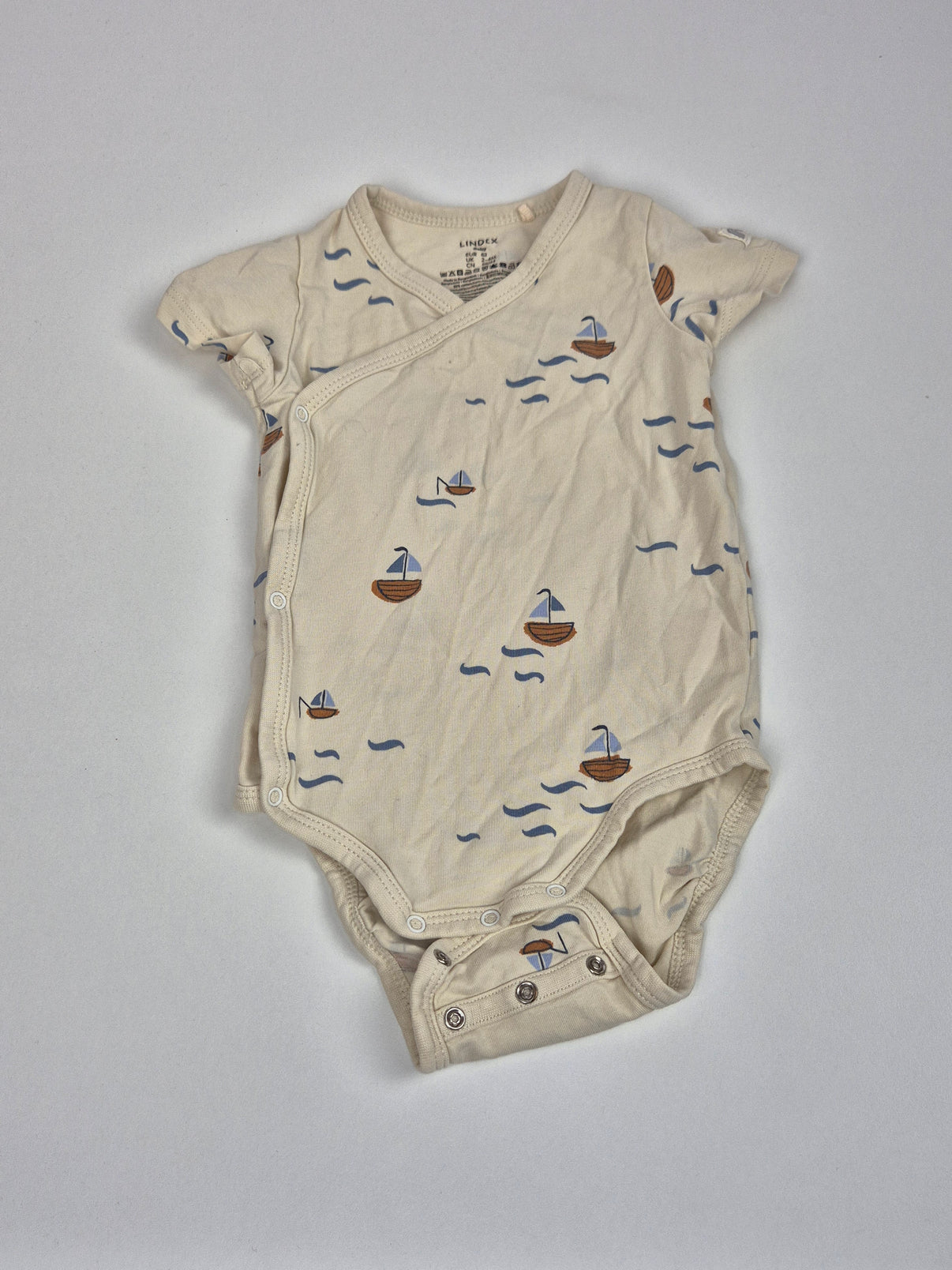 Měkoučké zavinovací body Lindex s potiskem plachetnic v béžovém odstínu. Díky praktickému zapínání na patentky se snadno obléká a prodlužovací střih zajišťuje delší využití. Perfektní volba pro pohodlí i styl nejmenších.