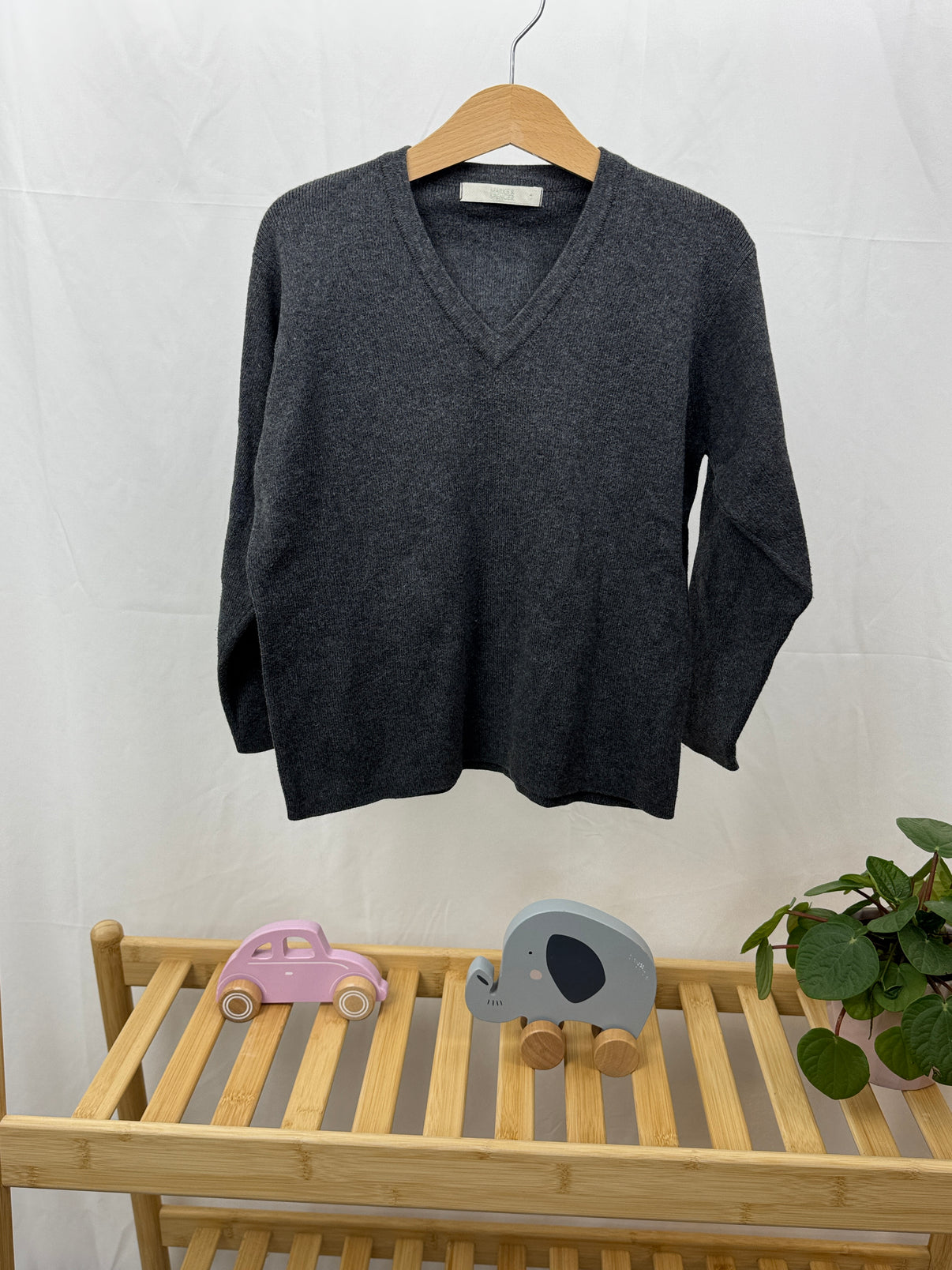 Stylový a kvalitní svetr od značky Marks & Spencer ve velikosti 5–6 let. Tento svetr je v univerzální tmavě šedé barvě, ideální pro každodenní nošení i na slavnostnější příležitosti. Díky výstřihu do V a jemnému úpletu poskytuje pohodlí a snadno se kombinuje s košilí nebo tričkem. Skvělá volba pro chladnější dny.