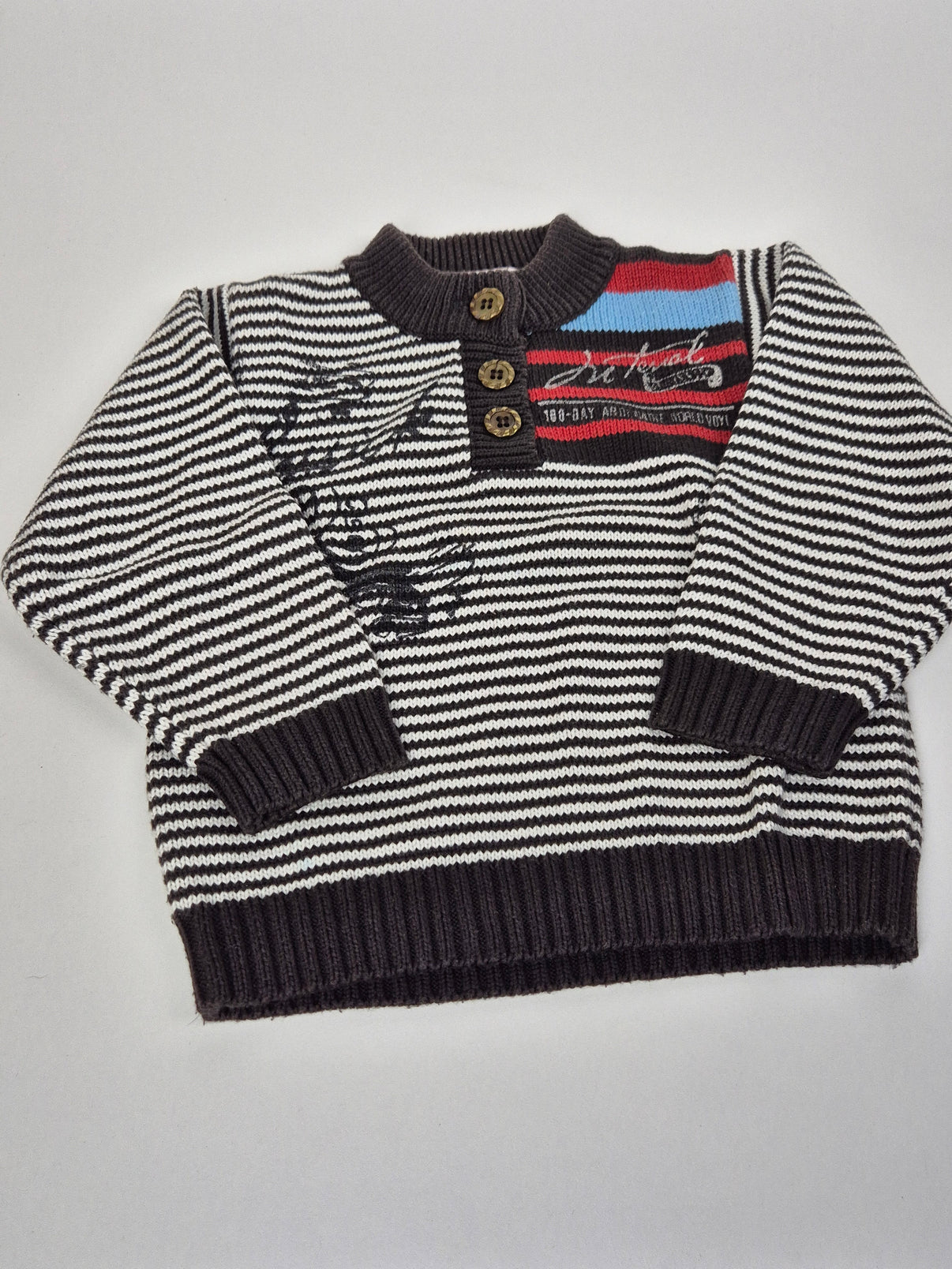 Stylový pletený chlapecký svetr značky Q&D s proužkovaným vzorem v kombinaci bílé, černé a tmavě hnědé barvy. Oživují ho barevné detaily na ramenou a výrazný nápis na hrudi. Má pohodlný střih s žebrovanými manžetami a spodním lemem, které dobře drží tvar, a knoflíčky u krku pro snadné oblékání. Vyrobený z měkkého, hřejivého materiálu – ideální volba pro podzimní a zimní dny.