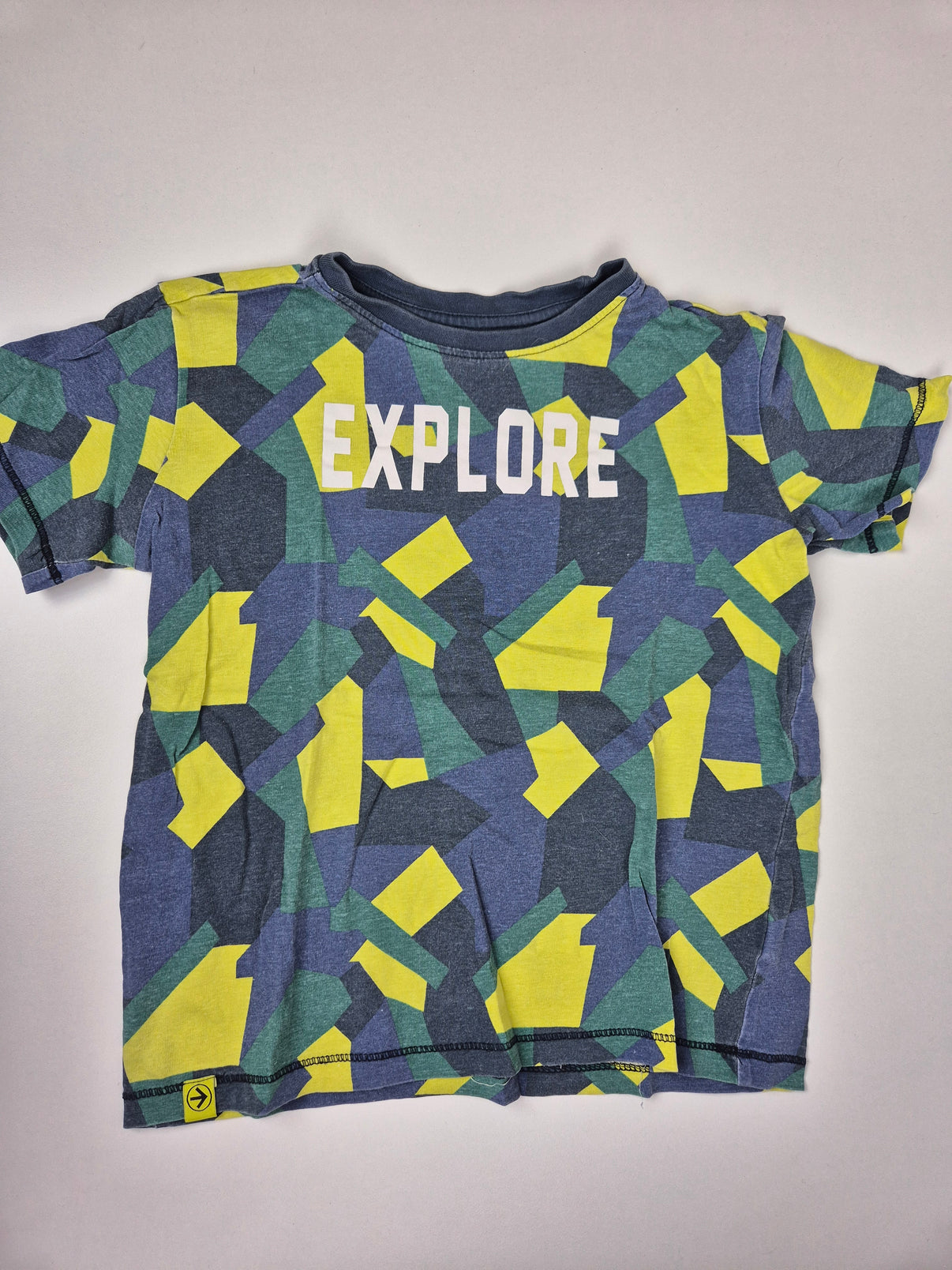 Tmavě modré tričko značky Reserved s výrazným geometrickým potiskem v odstínech zelené, žluté a modré a nápisem EXPLORE. Kombinace barev působí moderně a hravě, celoplošný vzor dodává tričku sportovní a dobrodružný charakter.