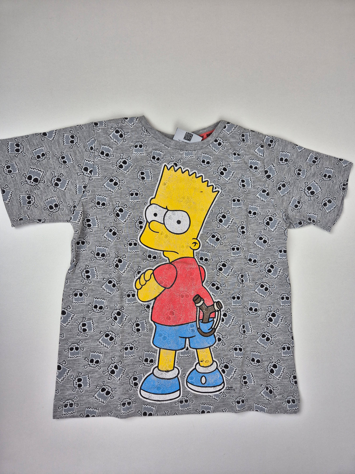 Šedé melírované tričko s krátkým rukávem s výrazným motivem Simpsonových – hlavní roli hraje Bart Simpson v ikonickém barevném provedení. Celoplošný drobný potisk lebek na šedém podkladu dodává tričku lehce rebelsky hravý vzhled, který děti milují.