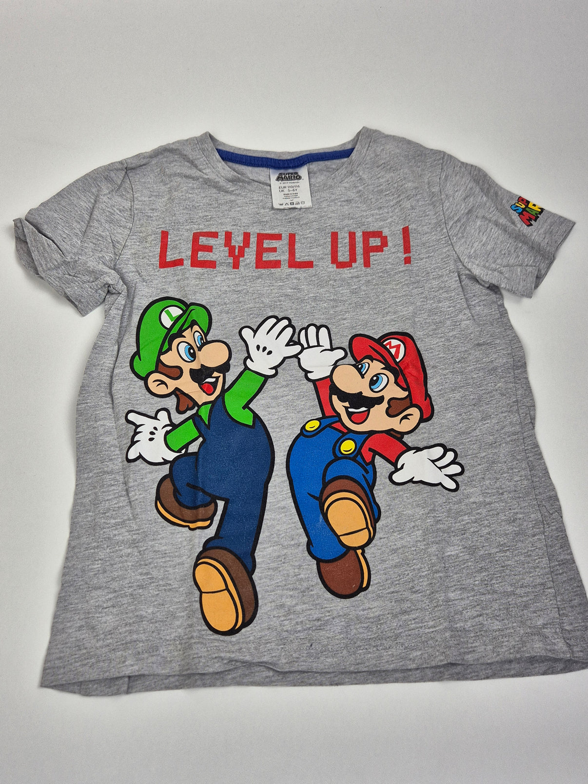 Šedé tričko značky Lindex s oblíbeným motivem Super Mario a nápisem Level up!. Melírovaný šedý podklad krásně zvýrazňuje barevný potisk Maria a Luigiho, který je výrazný, hravý a ideální pro malé fanoušky herního světa.