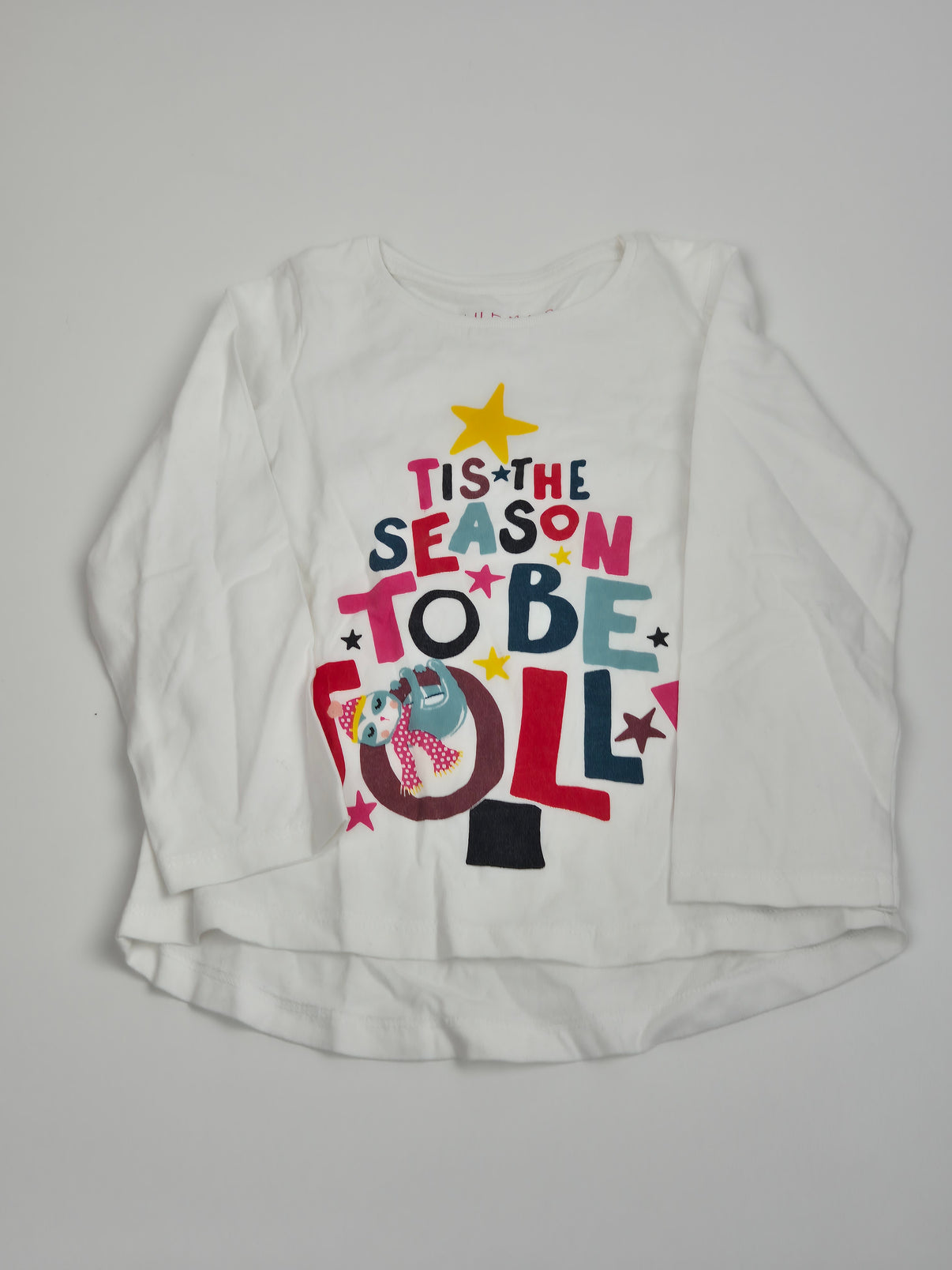 Bílé tričko z příjemné bavlny s veselým vánočním potiskem navodí tu pravou sváteční atmosféru. Barevný motiv se stromečkem, hvězdičkami a nápisem “’Tis the season to be jolly” působí hravě a mile, ideální pro holčičku i kluka. Skvělé na vánoční focení, besídku ve školce i pohodové sváteční dny doma. Díky dlouhému rukávu se hodí i do chladnějšího zimního počasí.
