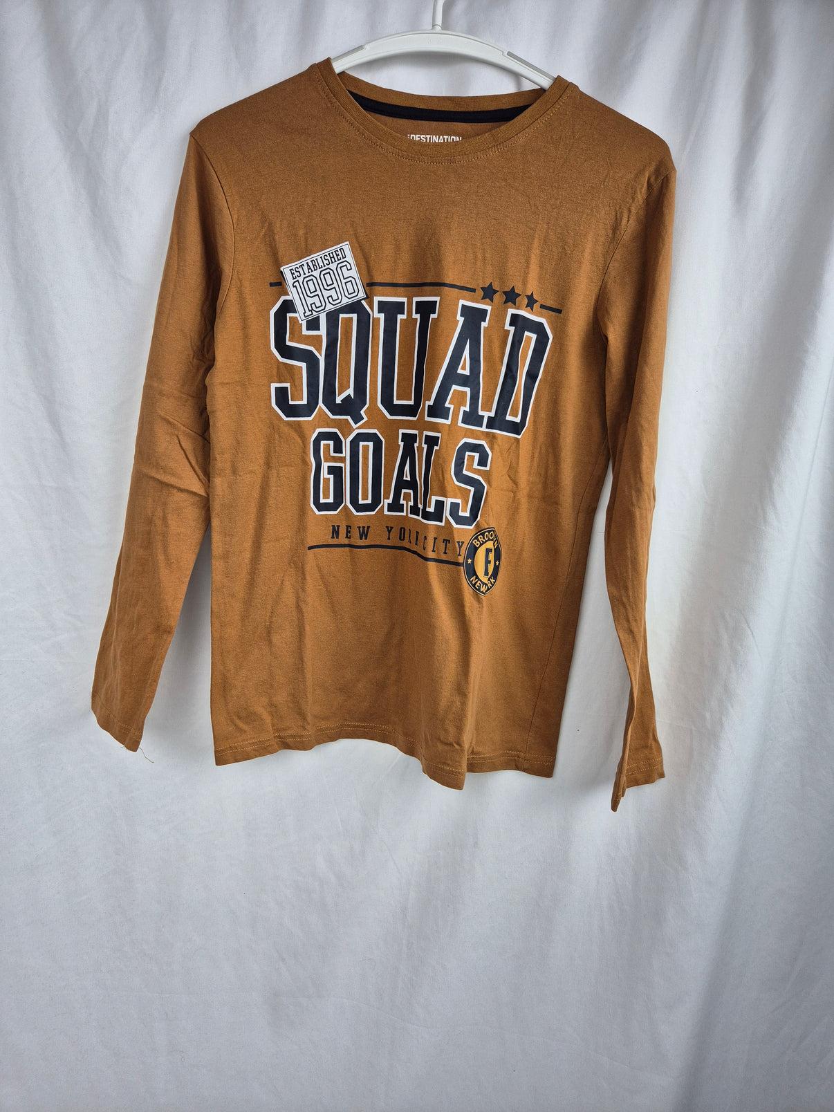 Stylové tričko Destination v teplé karamelové barvě s dlouhým rukávem a výrazným nápisem SQUAD GOALS na hrudi. Bavlněný materiál je příjemný na nošení a zaručuje pohodlí během celého dne. Skvělý kousek pro kluky – do školy, na volný čas i víkendové výlety.